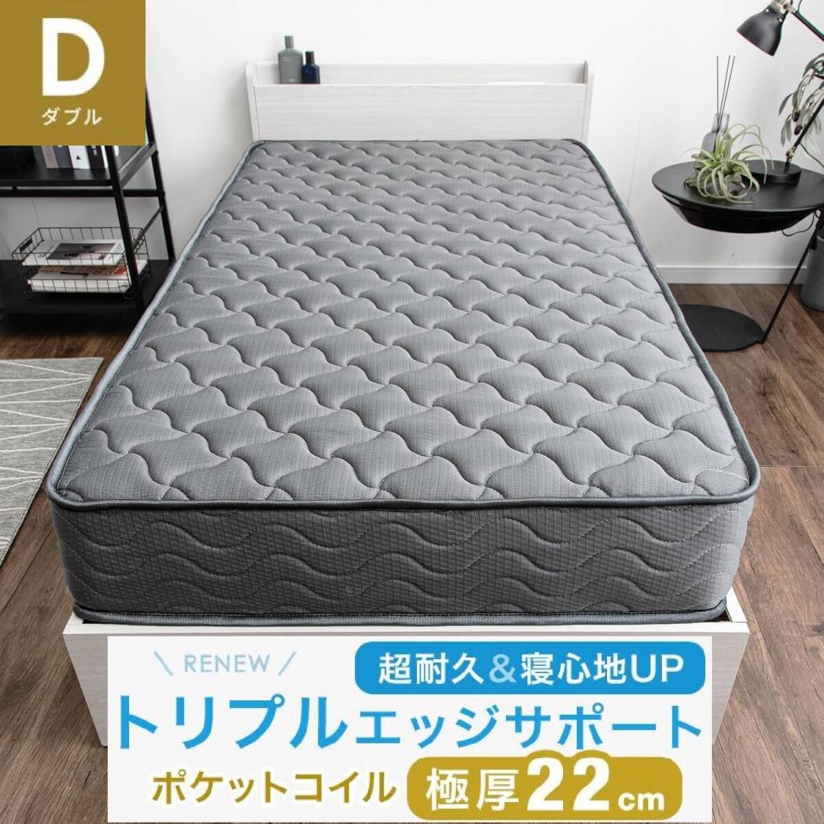 マットレス ダブル 極厚22cm 高密度 736個 ポケットコイル 通気性 3Dメッシュ 二層ウレタン ニット生地 ベッドマットレス グレー