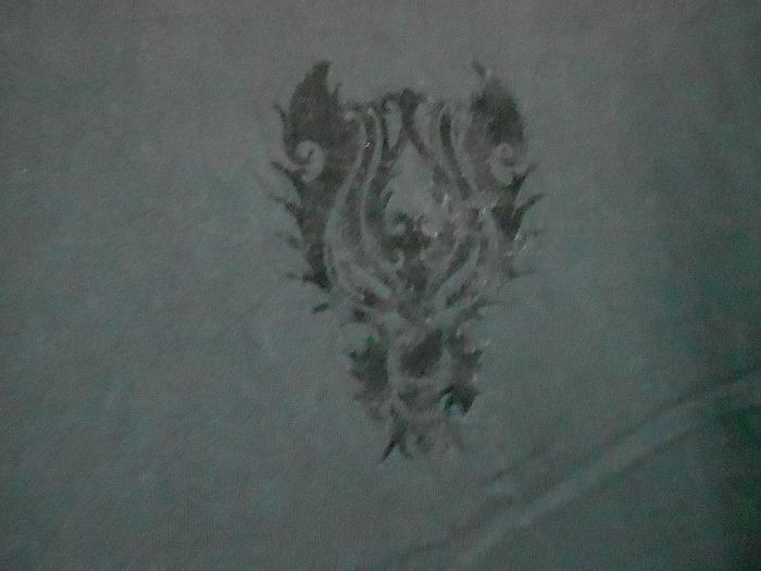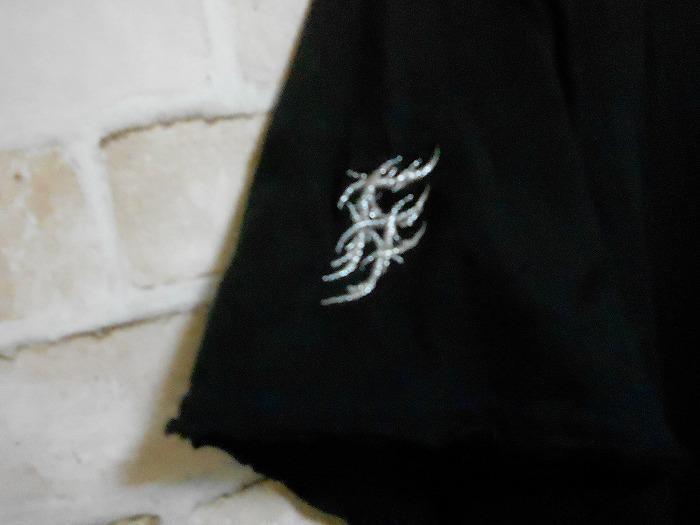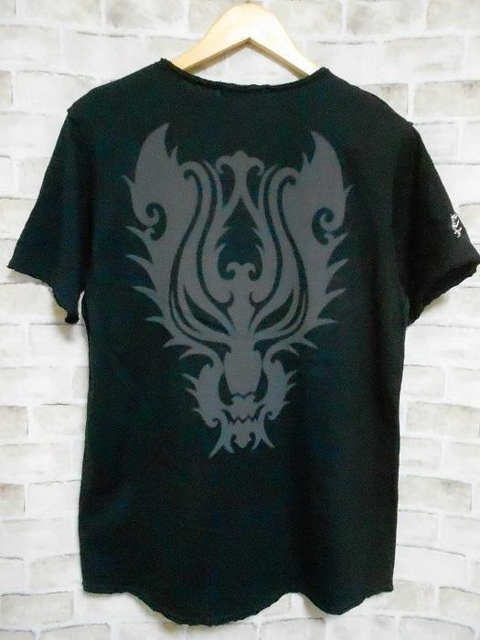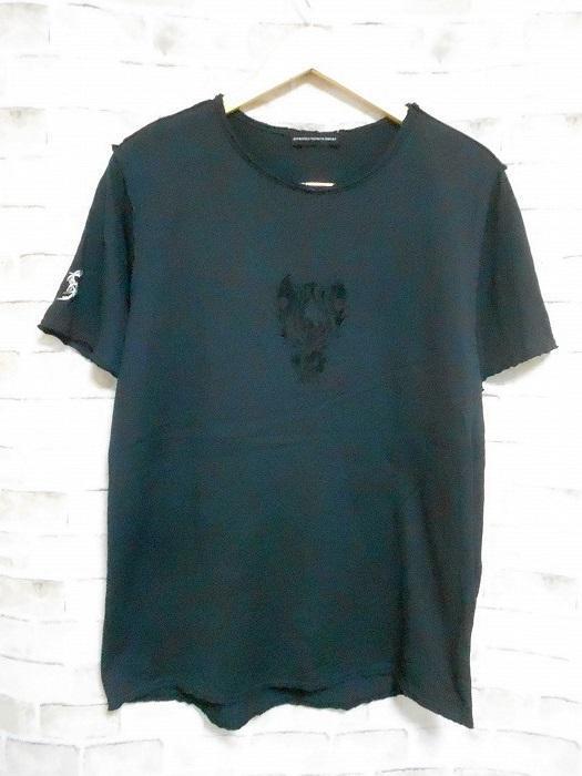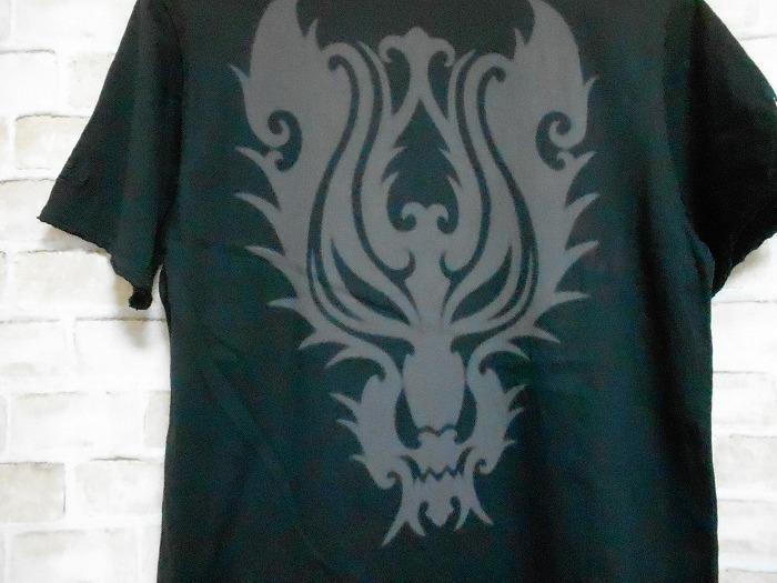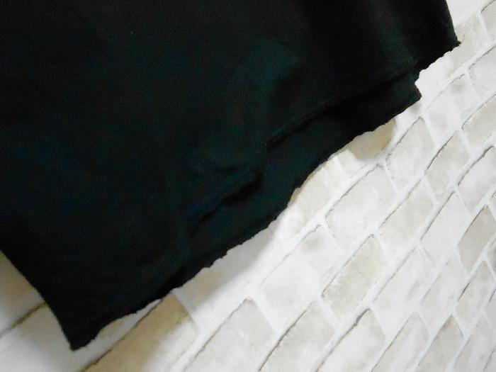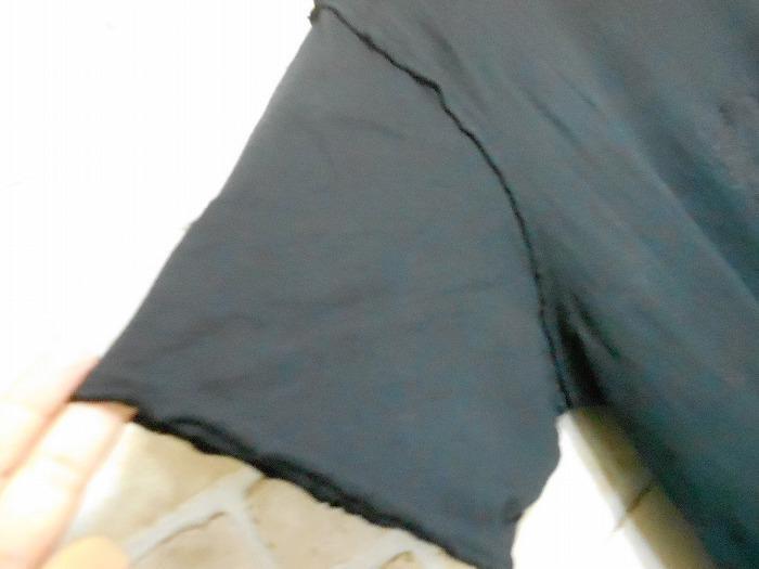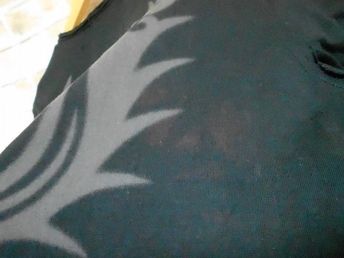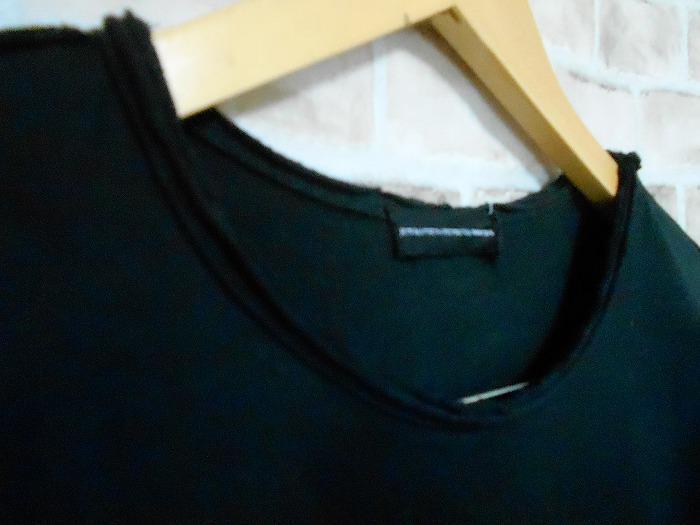 色は黒。首周り・袖口・裾周りが切りっぱなしのような加工になってます、背中に赤い汚れがあります。