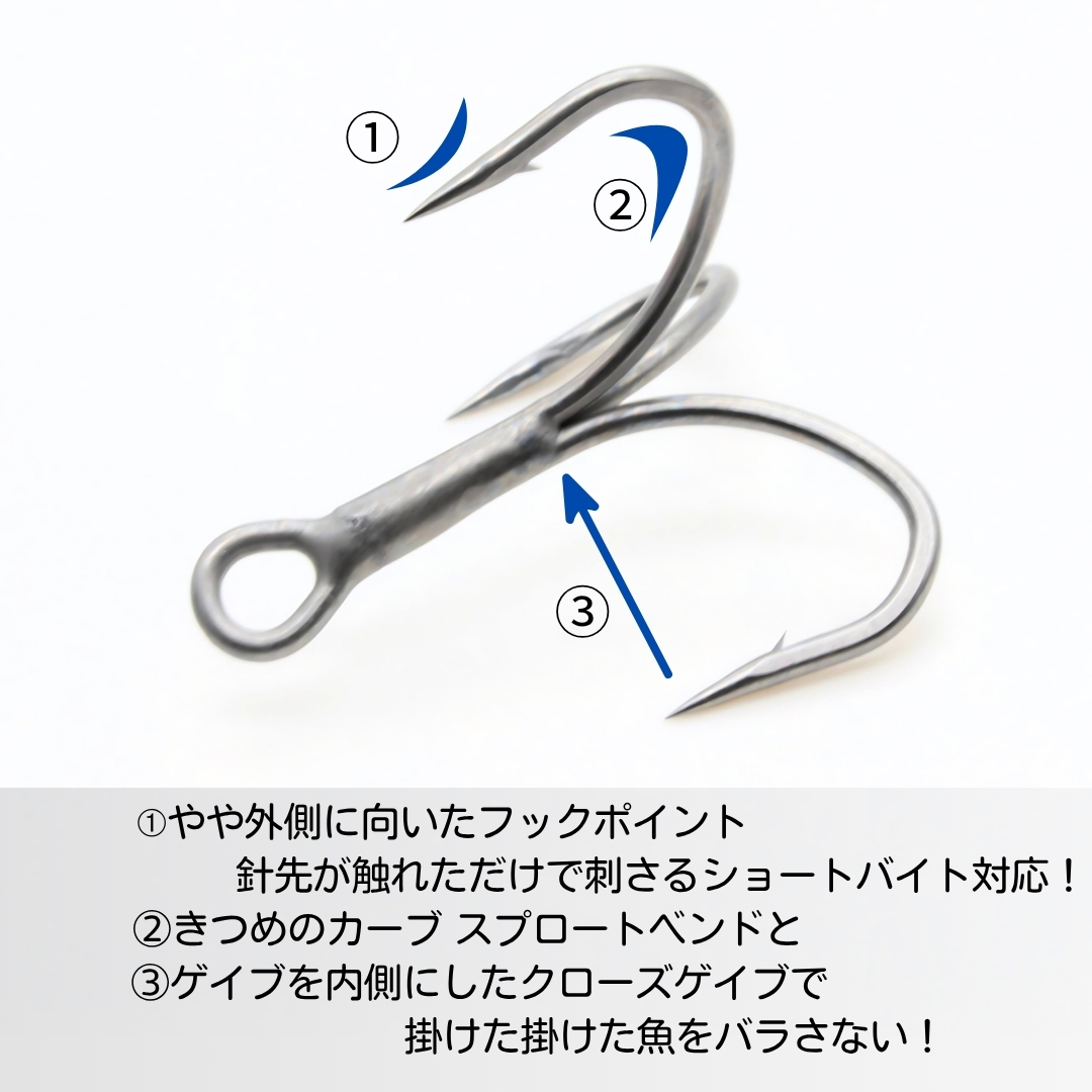 バラしやすい魚種である、シーバスに特化したトレブルフック。