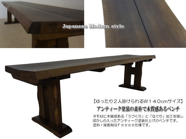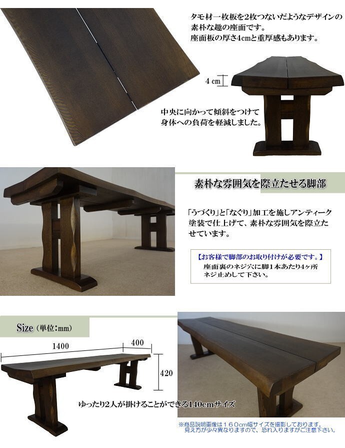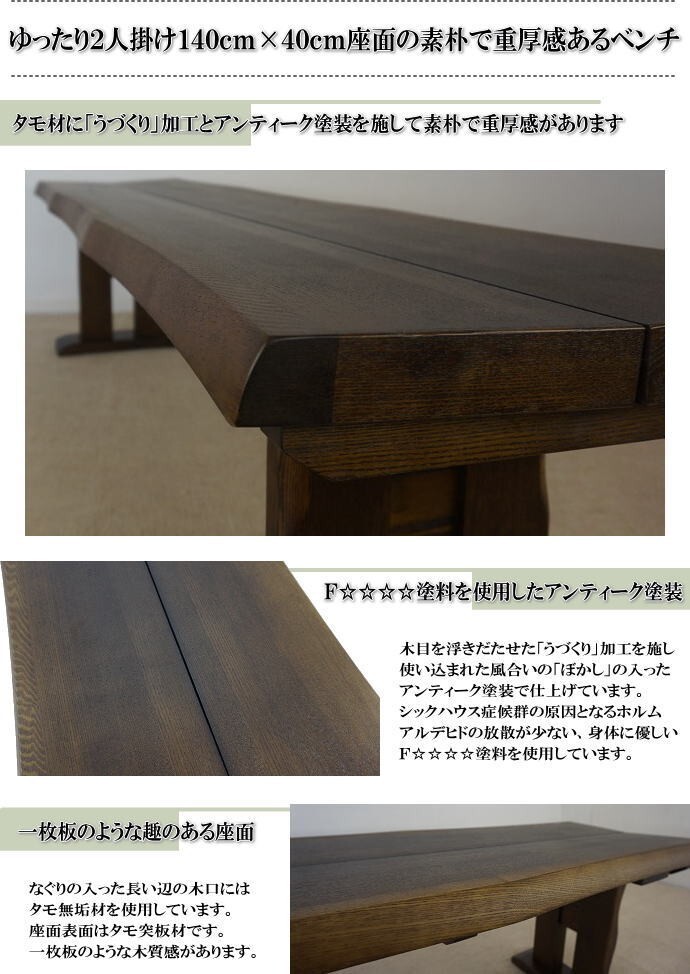 | 【商品特徴】 | ◇ゆったり2人掛けられる140cm幅ベンチの単品販売です。 ◇木部はタモ材を使用し、ぼかしを加えたアンティーク塗装を施した素朴な民芸調の趣です。接着剤・塗料は、からだに優しいF☆☆☆☆を使用しています。 ・タモ材に「うづくり」加工とアンティーク塗装を施して素朴で重厚感があります。 ・木目を浮きだたせた「うづくり」加工を施し使い込まれた風合いの「ぼかし」の入ったアンティーク塗装で仕上げています。シックハウス症候群の原因となるホルムアルデヒドの放散が少ない、身体に優しいF☆☆☆☆塗料を使用しています。 ・なぐりの入った長い辺の木口にはタモ無垢材を使用しています。座面表面はタモ突板材です。一枚板のような木質感があります。 ・タモ材一枚板を2枚つないだようなデザインの素朴な趣の座面です。座面板の厚さ4cmと重厚感もあります。 ・脚にも「うづくり」と「なぐり」加工を施しアンティーク塗装で仕上げて、素朴な雰囲気を際立たせています。 ・ゆったり2人が掛けることができる幅140cmサイズ。 ・お客様にて脚のお取り付けが必要です。 | |