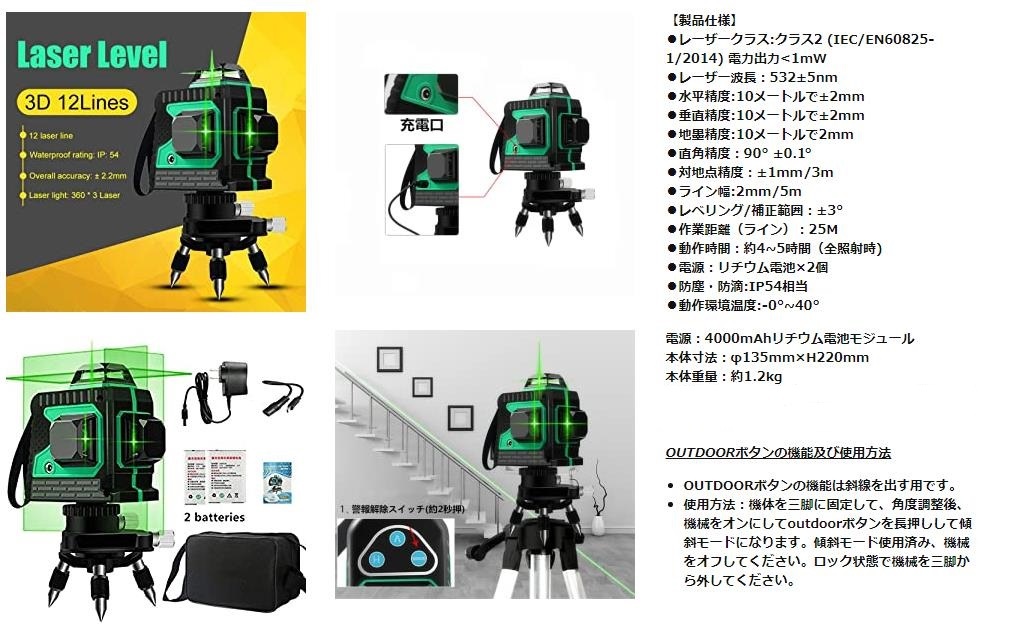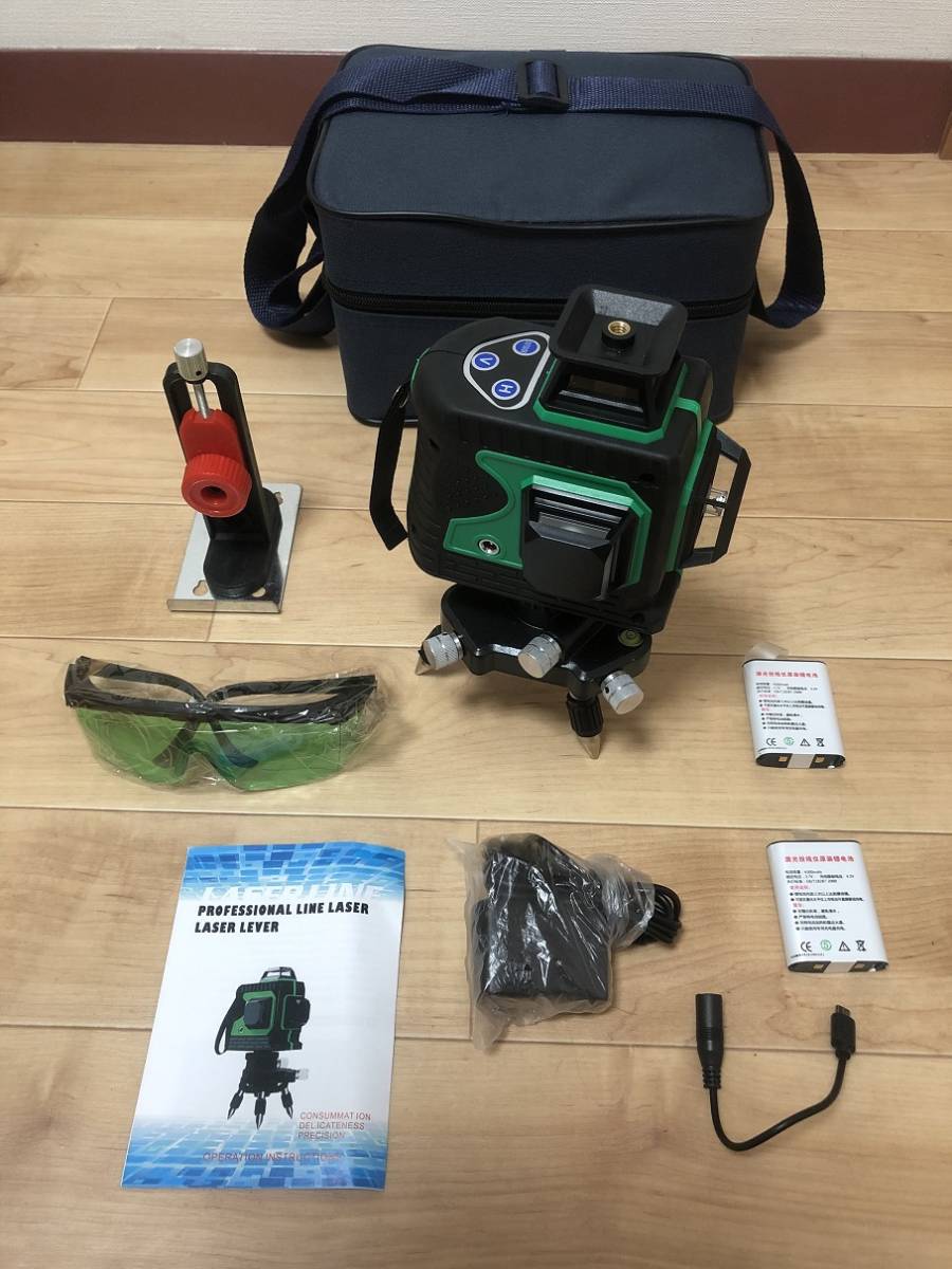 12ライン グリーン レーザー墨出し器 3D/墨出器/水平器/測定器/墨出し機/墨だし器/自動補正機能 高輝度 高精度 360°4方向大矩照射モデル