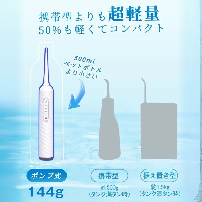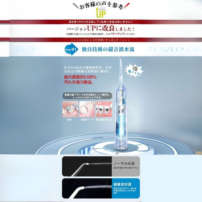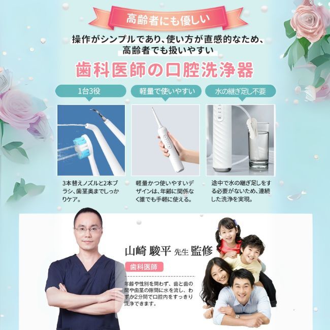 ご覧いただきありがとうございます。 商品名:口腔洗浄器 【この商品が品質で選ばれる理由】 ジェットウォッシャーと電動歯ブラシの2WAYで、タンクレス設計と大容量バッテリーにより、効果的かつ手軽に口腔ケアができます。 ■こんな悩みありませんか? ・歯ブラシだけでは、歯と歯の間の汚れが気になる… ・口腔ケアをもっと手軽に、衛生的に行いたい… ・旅行先でも自宅と同じようにしっかり歯のケアをしたい… ★こんな時におすすめ! ・毎日の歯磨きにプラスして、より徹底した口腔ケアをしたい時に! ・衛生的に口腔洗浄器を使いたい時に便利です! ・出張や旅行先でも、手軽に持ち運んでオーラルケアを続けたい時に役立ちます! ------------------------------------- ◆商品説明 【最新の2WAY口腔ケア】 ・ジェットウォッシャーと電動歯ブラシが一体となった革新的なデザインです。 ・水出し可能な歯ブラシヘッド付きで、歯磨きが終わったらノズルやヘッドを変換せずに直接フロスモードに変えて使用できます。 ・2in1の機能で広い範囲をケアでき、歯ぐきのマッサージや歯ぐきのキワの洗浄にも役立ちます。 【タンクレス設計で水の継ぎ足し不要】 ・従来の据え置き型口腔洗浄器の欠点を解決した、一度に給水ホースを本体に接続するタイプです。 ・途中で水を足す必要がなく、スムーズなケアが可能です。 ・IPX7等級の防水性能でお風呂場でもジェットウォッシャーを使うことが出来ます。 【大容量バッテリーで長時間使用可能】 ・2000mAhのバッテリーを内蔵し、フル充電時の使用可能時間は約60日間です(1日2回、各1分使用した場合)。 ・Type-C充電式なので、手軽に充電できます。 【パワフルな洗浄力とタイマー機能】 ・高い水圧と水流速度で歯垢や汚れをしっかりと洗い流すことができます。 ・歯と歯茎の間に入り込んだ汚れも効果的に除去し、口内の清潔を維持するのに役立ちます。 ・120秒おきに自動的に停止するタイマー機能が付いており、適切な洗浄時間を守ることができます。 ご不明な点などございましたら お気軽に「質問する」からお問い合わせください。 |