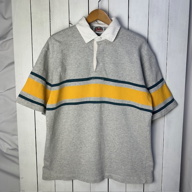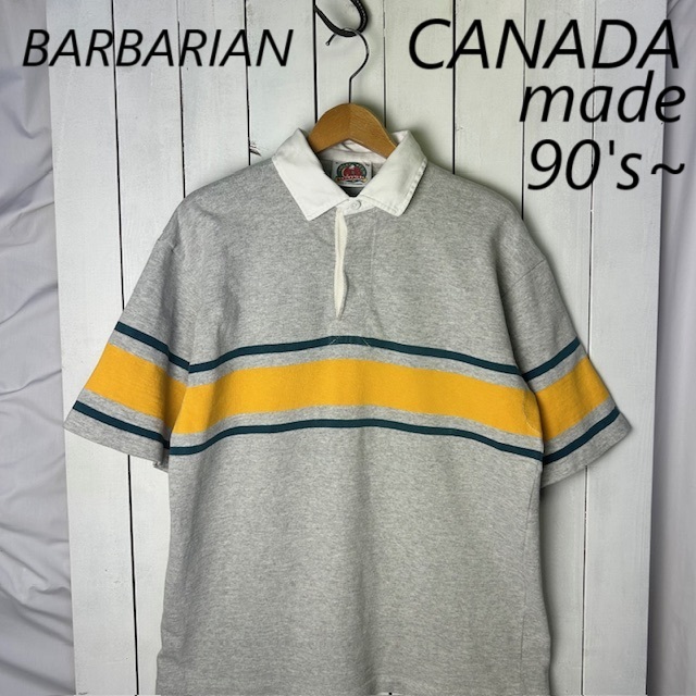 sh●893 90s~ カナダ製 BARBARIAN 半袖ラガーシャツ XL グレー×黄 オールド バーバリアン ラグビーシャツ 厚手