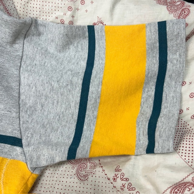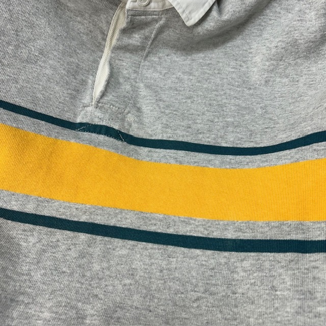 ●商品説明・・・90年代頃~のオールドのバーバリアンの半袖ラガーシャツです。しっかりした厚手(へービーウェイト)な生地感(CAMBERのマックスウェイトのTシャツ程度)で、脇部分もしっかり補強されたラガーシャツらしい丈夫でヘビーに着ていただける一着です。made in CANADA (カナダ製)で、素材はコットンで、色はライトグレーに黄色の深緑のラインが入っています。