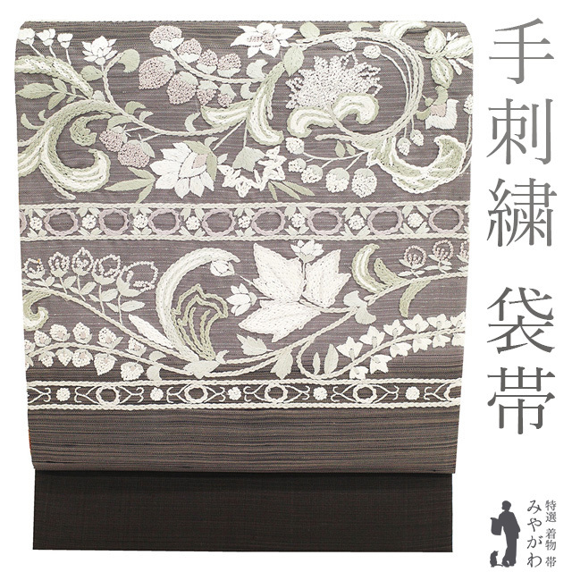 相良刺繍・手刺繍が施された、おしゃれな 袋帯 (仕立て上がり品)のご紹介です。