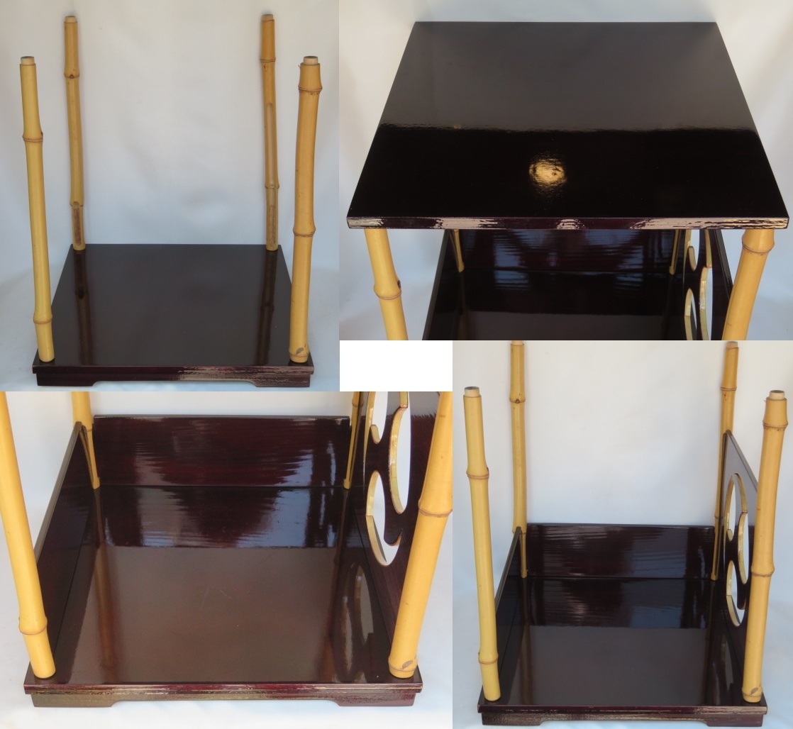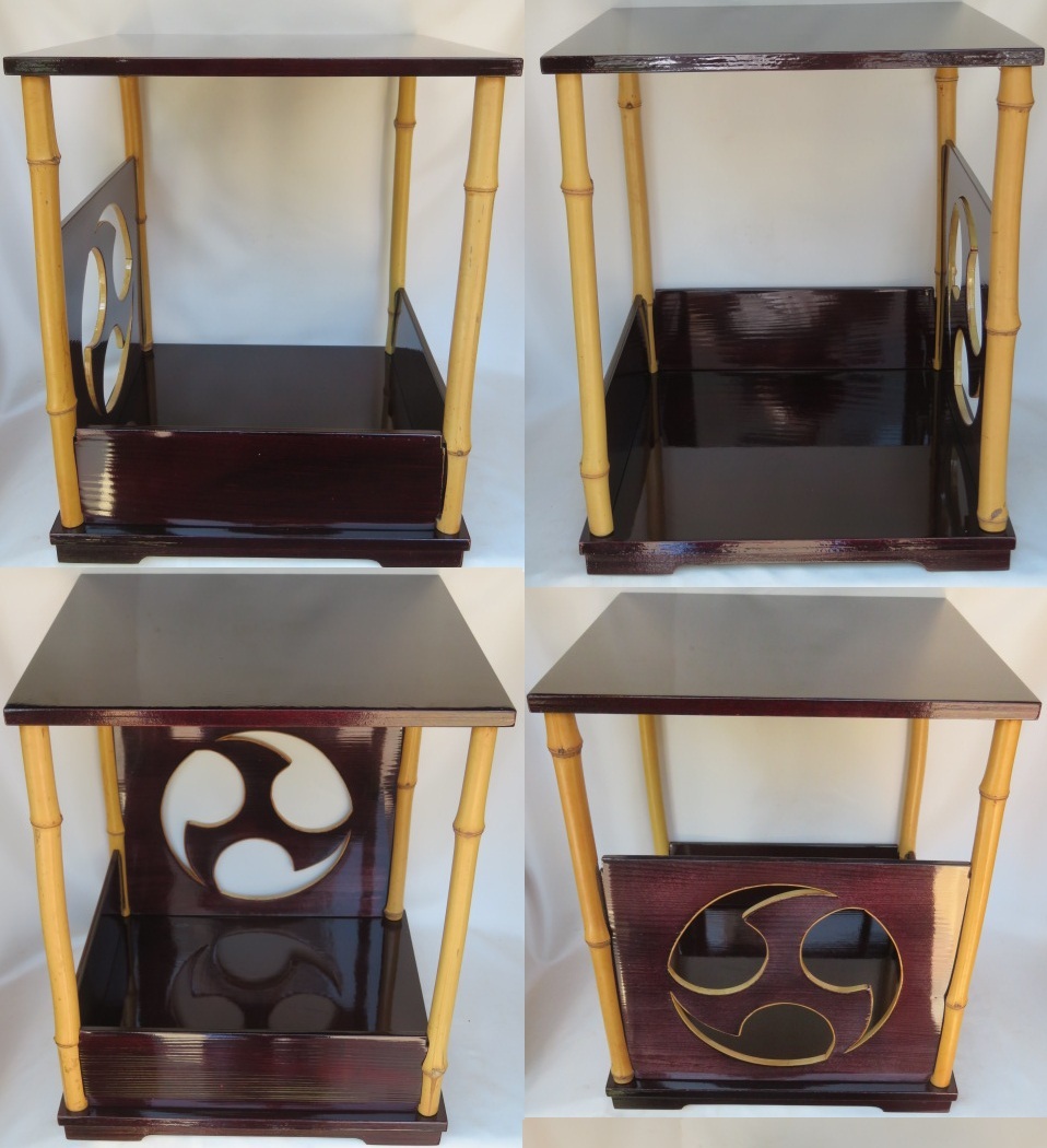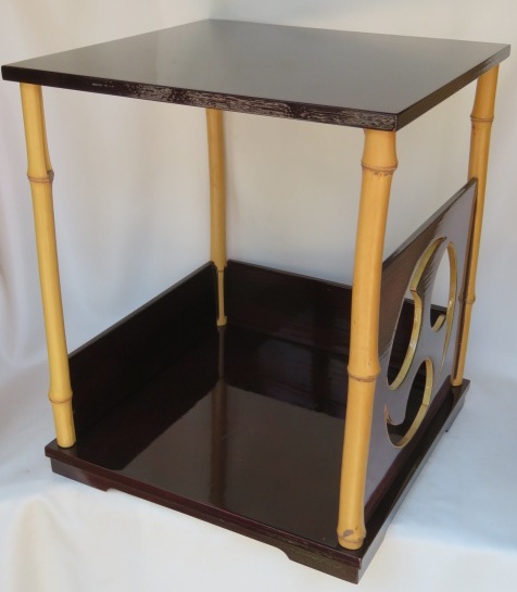 桐材の紅溜塗で、竹の四本柱、 天板は一尺九寸余の方形で端喰(はしばみ)入り、勝手付と向うに高さ三寸の腰、客付には小口が白竹張りの三つ巴の透しのある高さ八寸の腰板が嵌め込まれている小棚です。