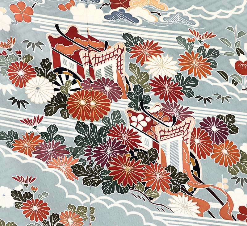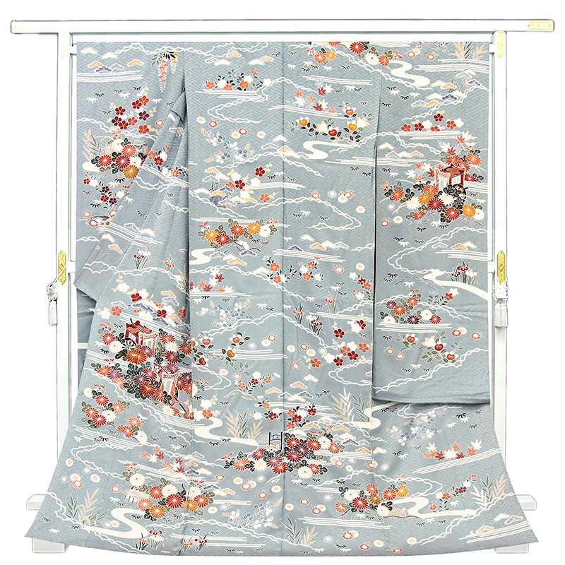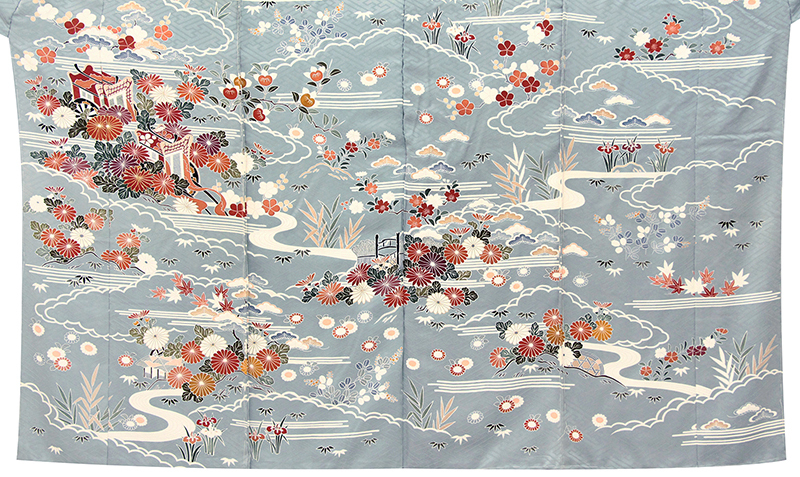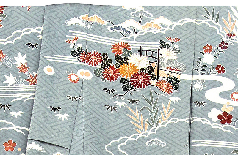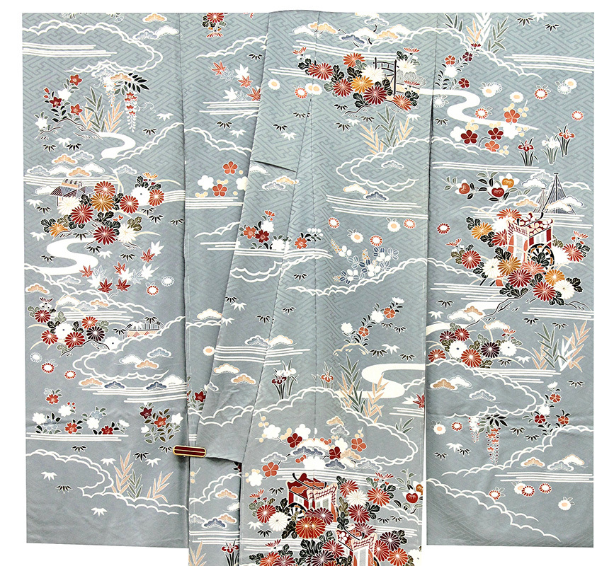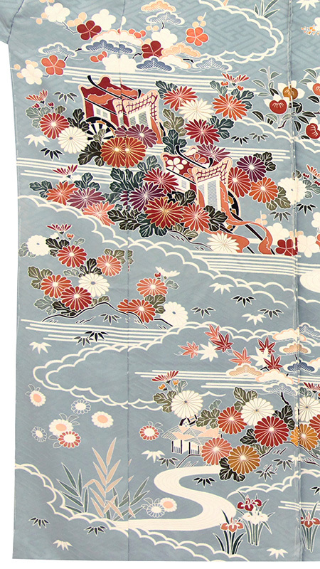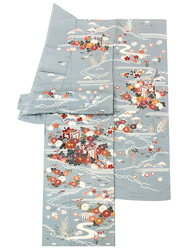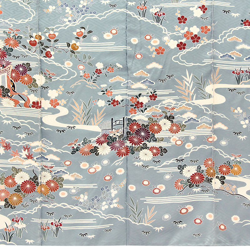 | ★品質・詳細 | ○地色 【こちらの地色は灰味の水色系です。】 ○絹織物 ○新品・未仕立の特撰振袖の仮絵羽です。 ○最高級別誂え地紋ちりめん地 ○参考上代 780,000円 |