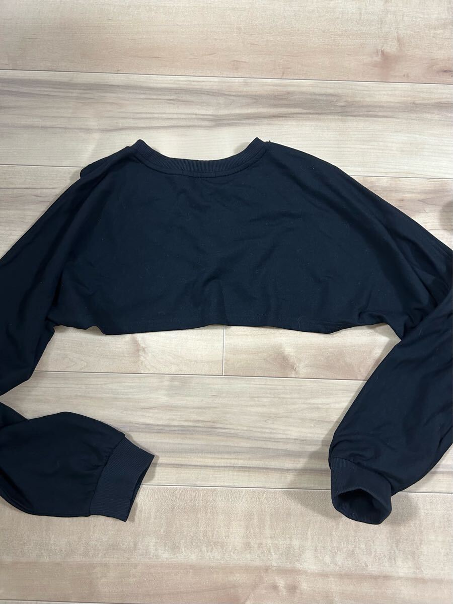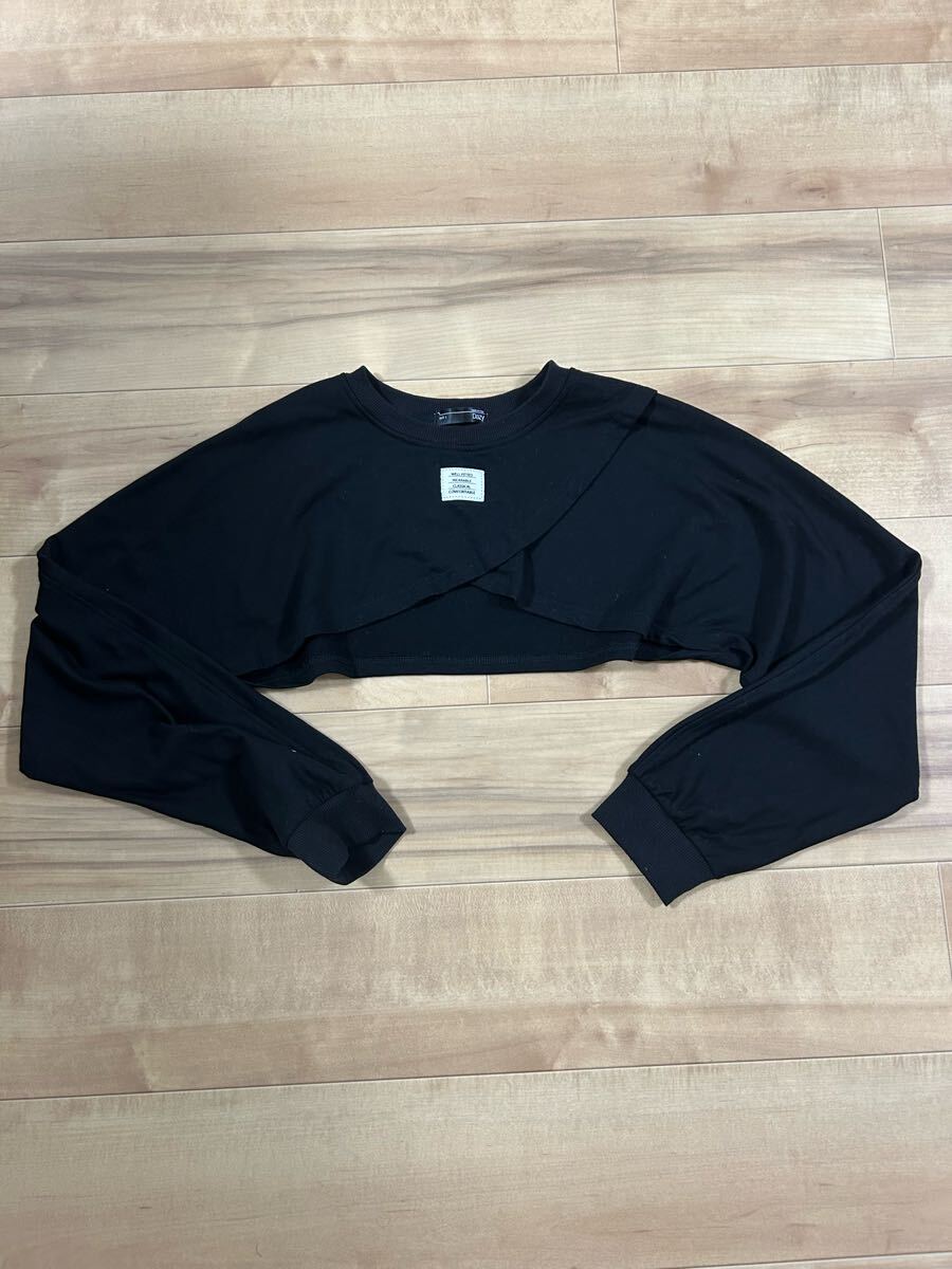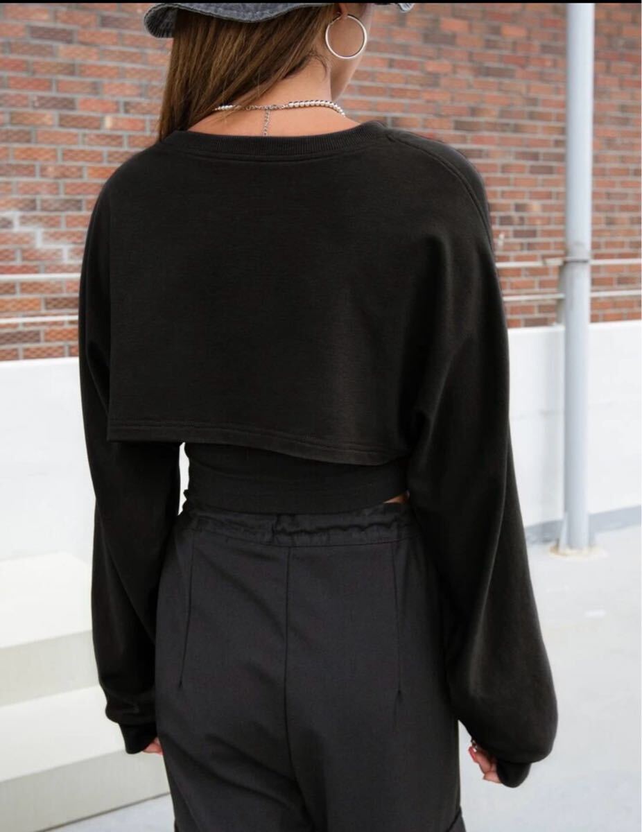 ウエアラブルで快適な黒のクロップド長袖トップス。