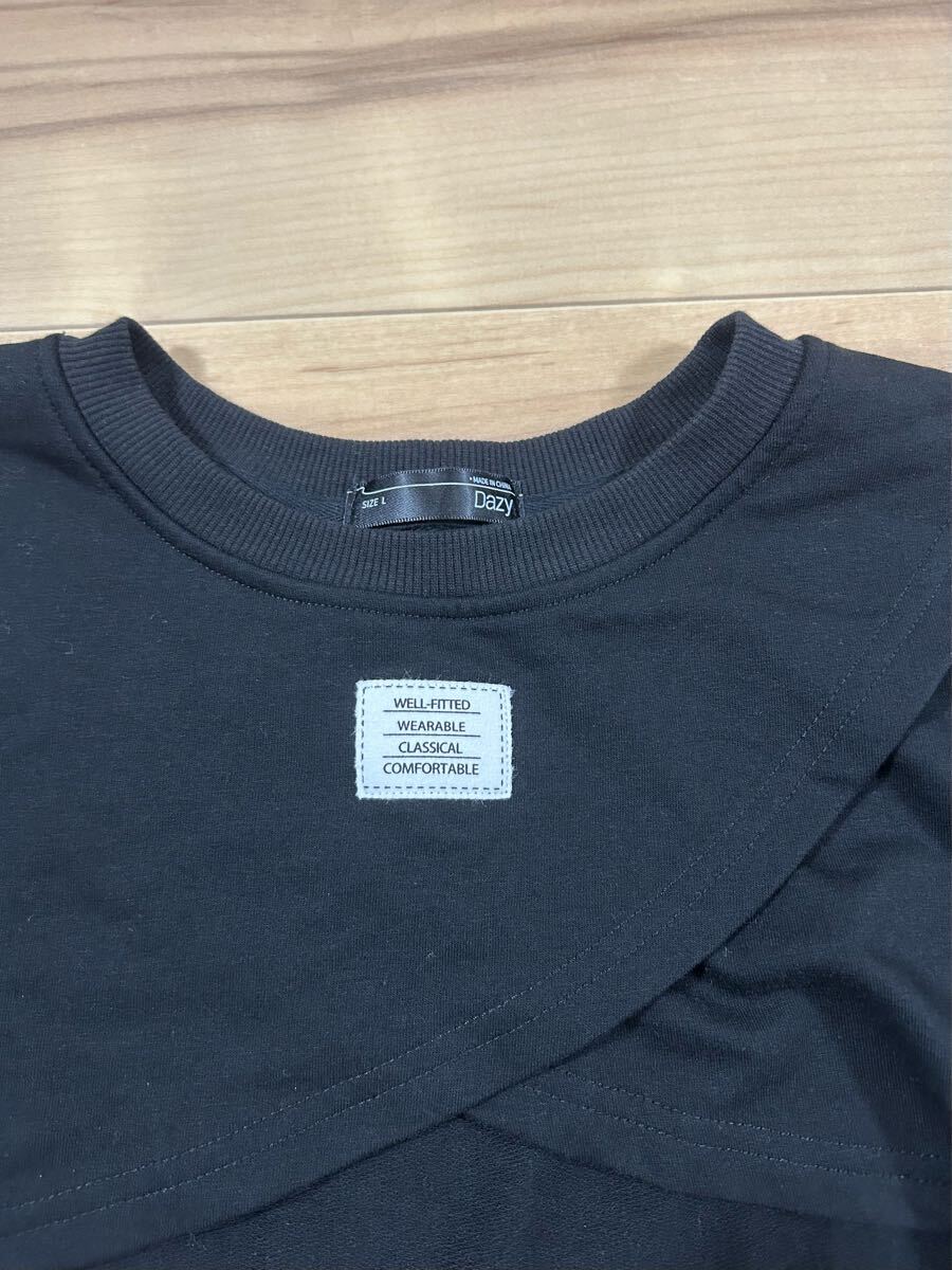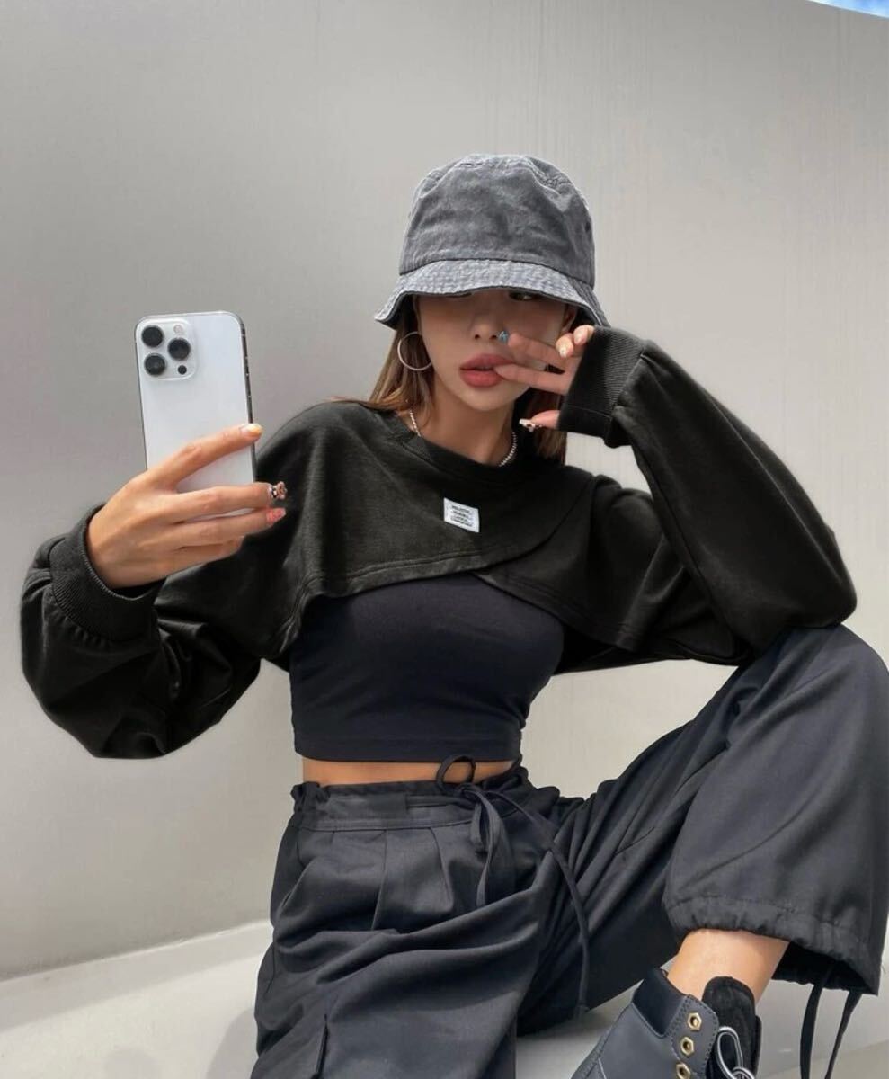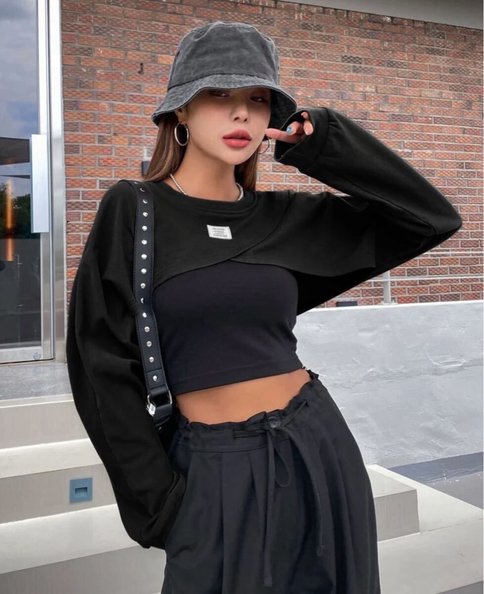 ウエアラブルで快適な黒のクロップド長袖トップス。