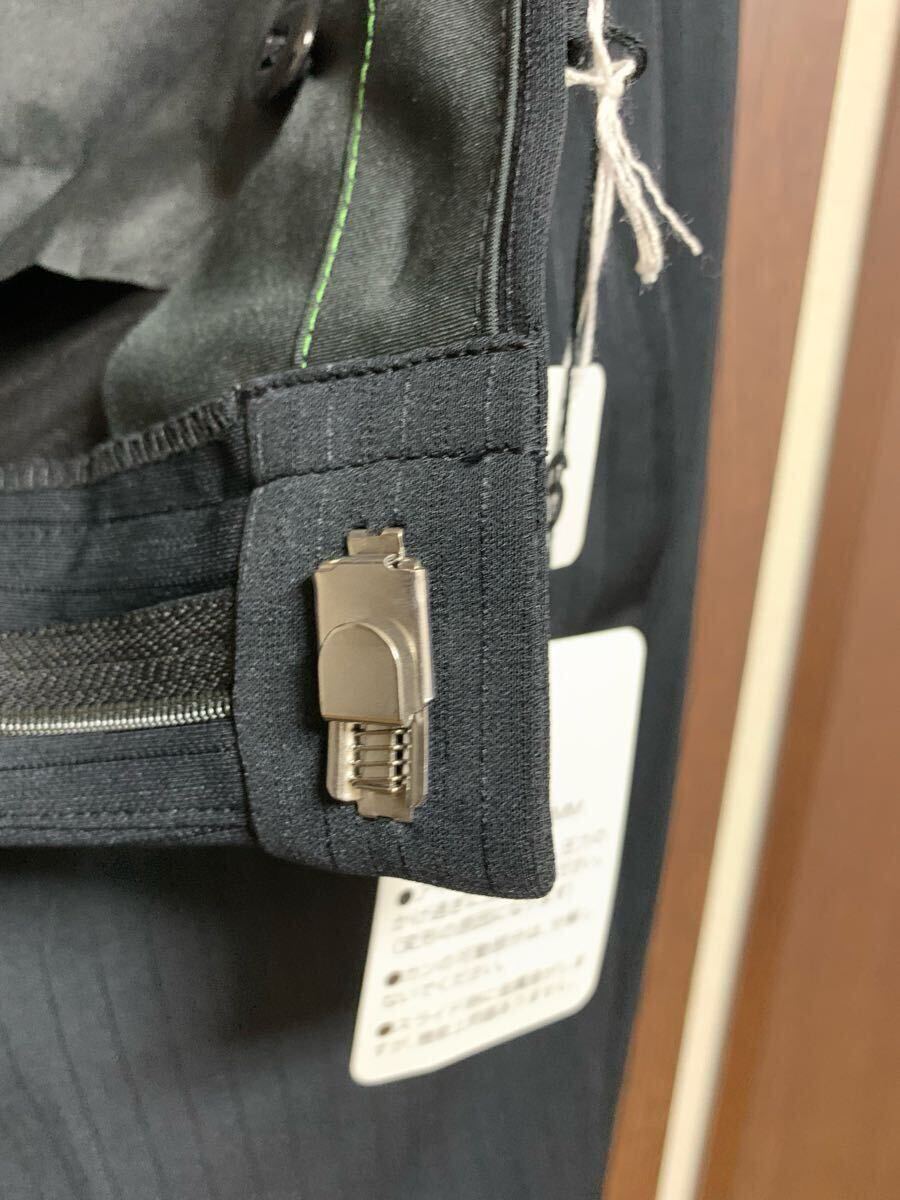 スラックスのウエストホックはバネで1.5cmほど伸びますので食事後のお腹周りも楽々!