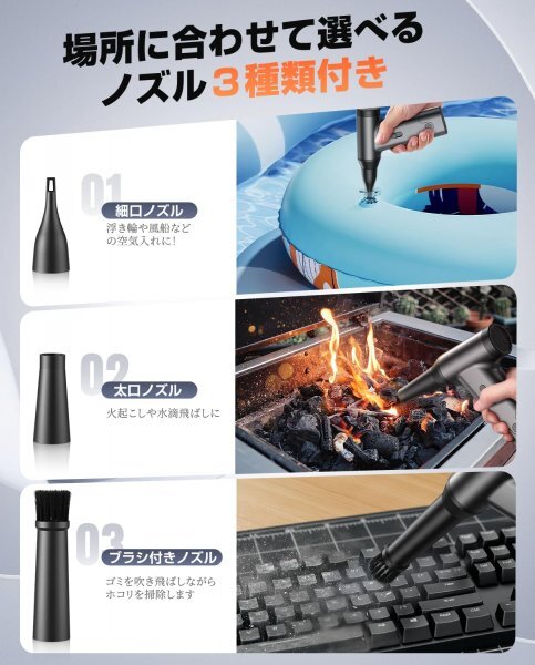 - 【付属品】エアダスター本体、細口ノズル、ブラシ付きノズル、太口ノズル、充電用USB Type-Cケーブル、収納ボックス、日本語取扱説明書(保証書付き)。