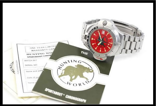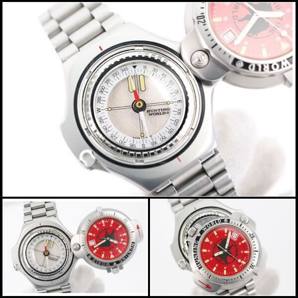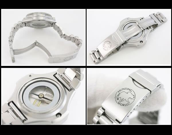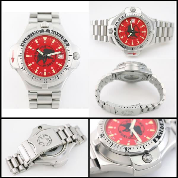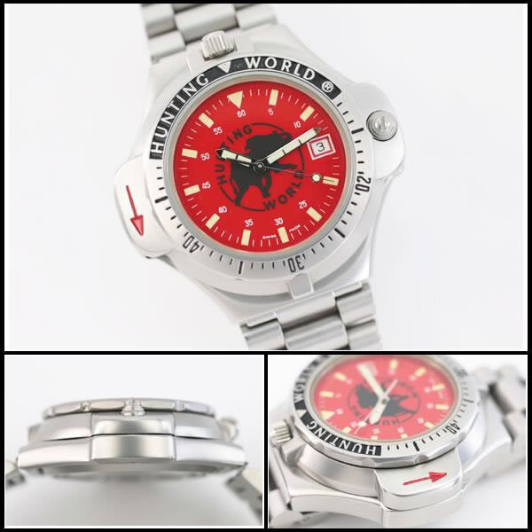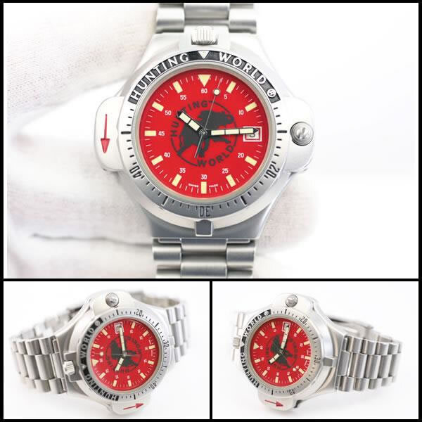 | その他商品説明 | 世界的なアウトドアファッションブランドとして知られるハンティングワールドから、シルバーボディにレッドダイヤルのカラーリングが大変印象的なメンズウォッチをご紹介します。当商品はスポーティーなラウンドケースに個性的なデザインが印象的で、本体表面を赤い矢印方向にスライドさせることによりコンパスが使用可能な大変珍しいアウトドアウォッチです。また、鮮やかなレッドカラーのダイヤル上にはブランドの証しとも言える仔象のロゴマークがあしらわれており、デザインのアクセントにもなっています。どんなファッションとも相性が良く、スーツからカジュアルまで幅広くマッチします。この機会に是非ご検討下さい。 状態:よく見れば本体・ブレスレットに若干の微細な小傷はありますが、いずれも気になるものではありません。出品にあたり電池新品交換済みです。当モデルは市場流通の極めて少ない品であり、当品のような美品は大変希少です。ランクA+につき自信を持ってお勧めします。 |