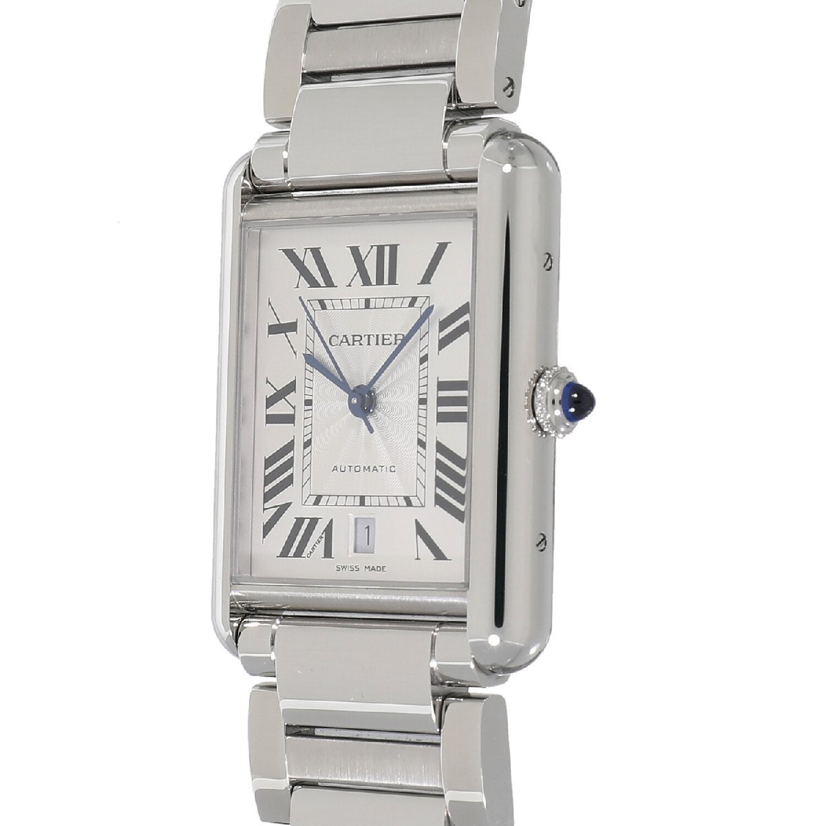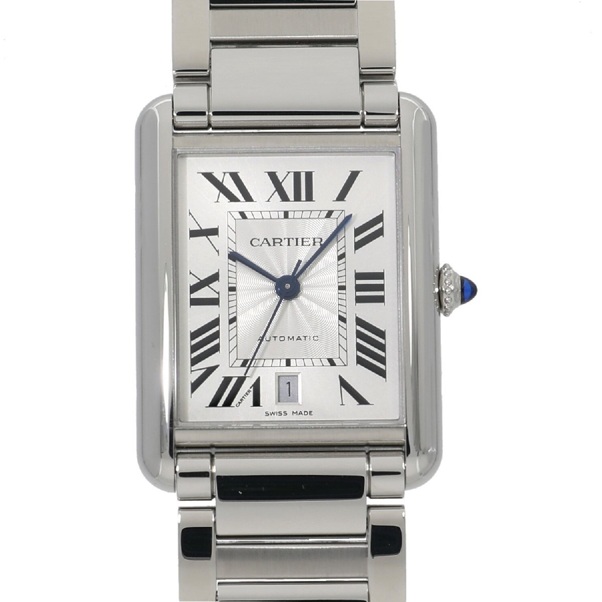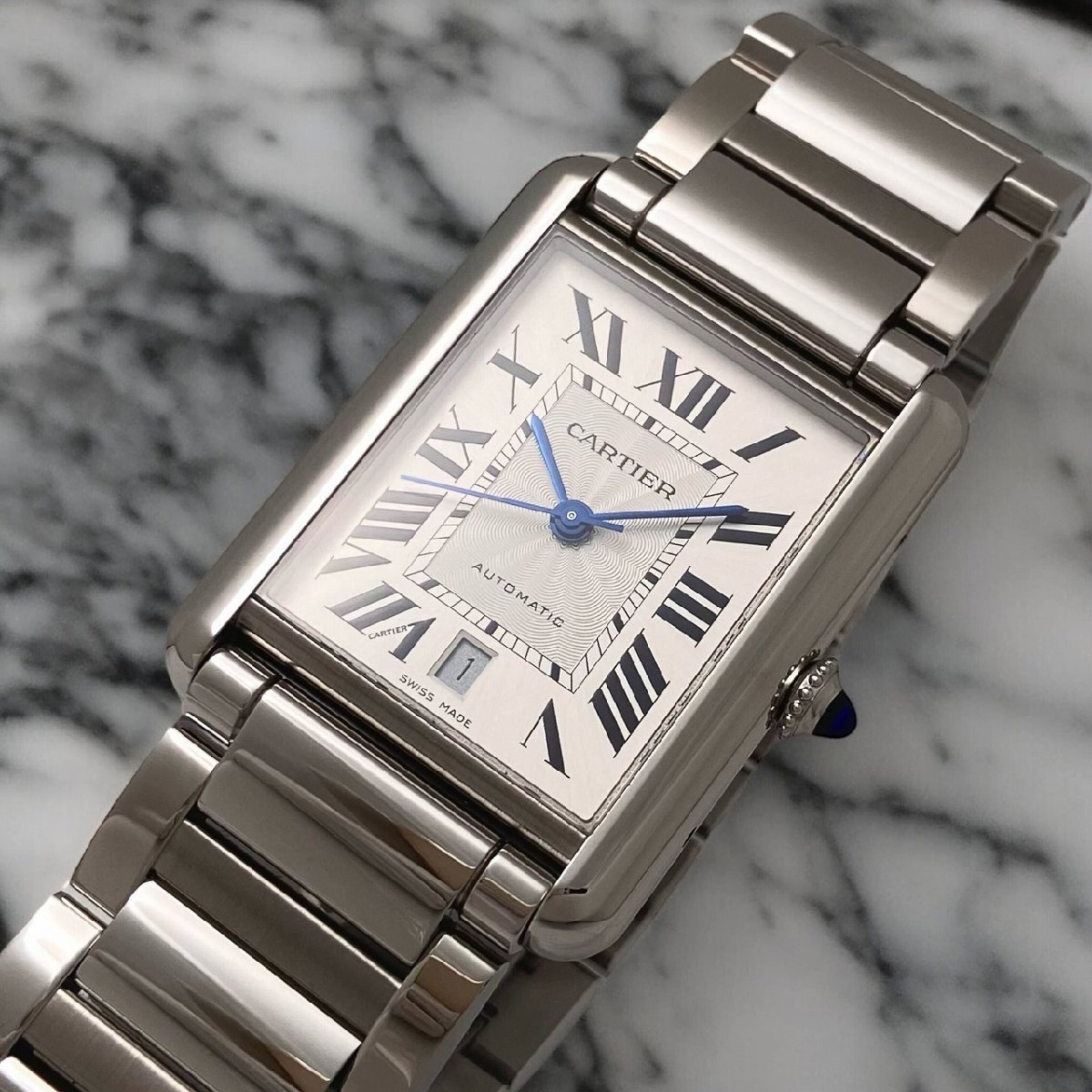 | モデルについて | 2021年の新作 100年以上の歴史を持つカルティエの人気シリーズ「タンク」に、かつては廃盤となったものの高い人気を得ていた「マスト」シリーズの要素を取り入れ生まれたのがこの「タンク マスト」。シルバーダイヤルには波打つような模様が特徴のフランケ装飾が施されており、青焼きされた3針がエレガントで美しいモデルです。現在3サイズ展開している中で最も大きなXLサイズで、ムーブメントは自動巻きキャリバー1847MCが搭載されています。 |