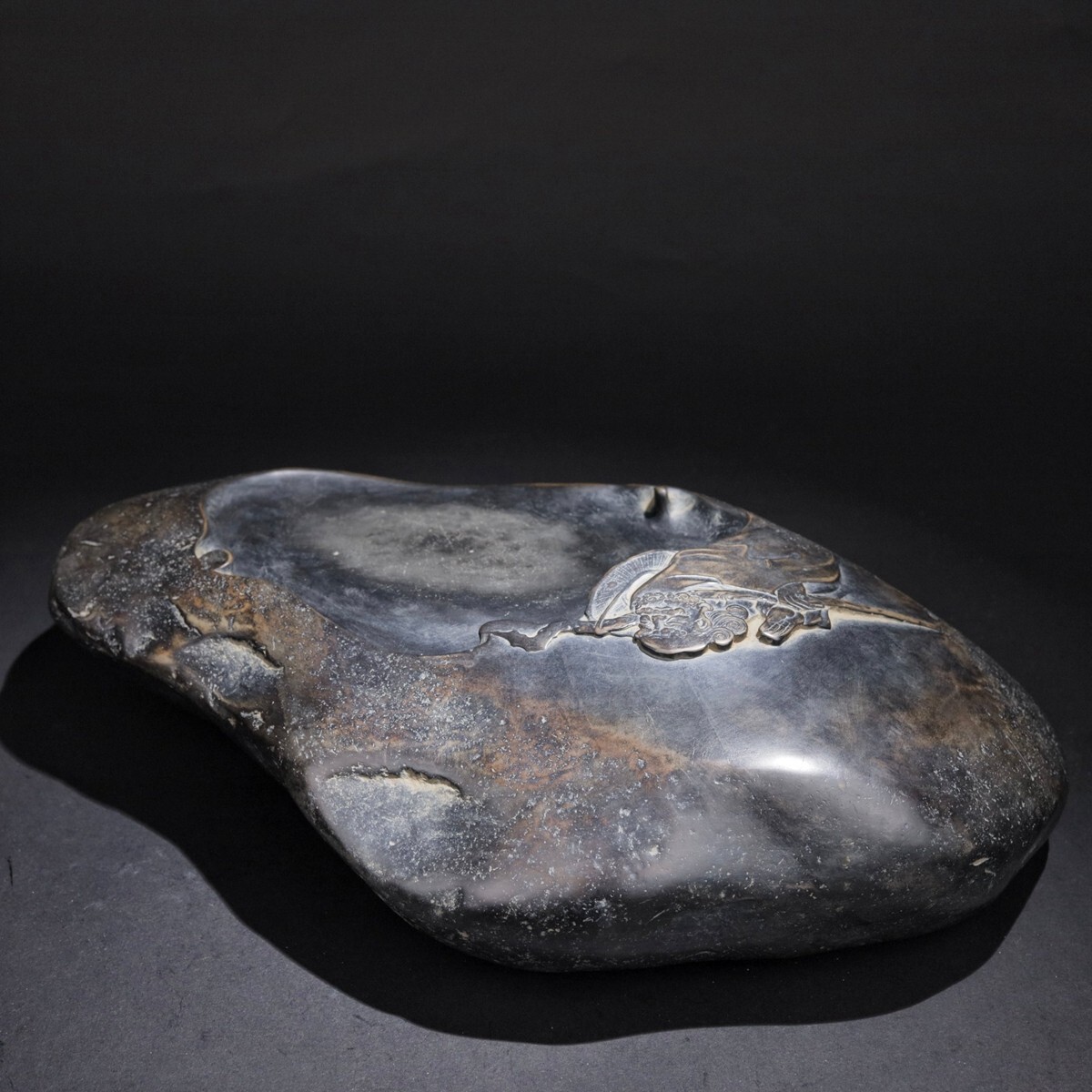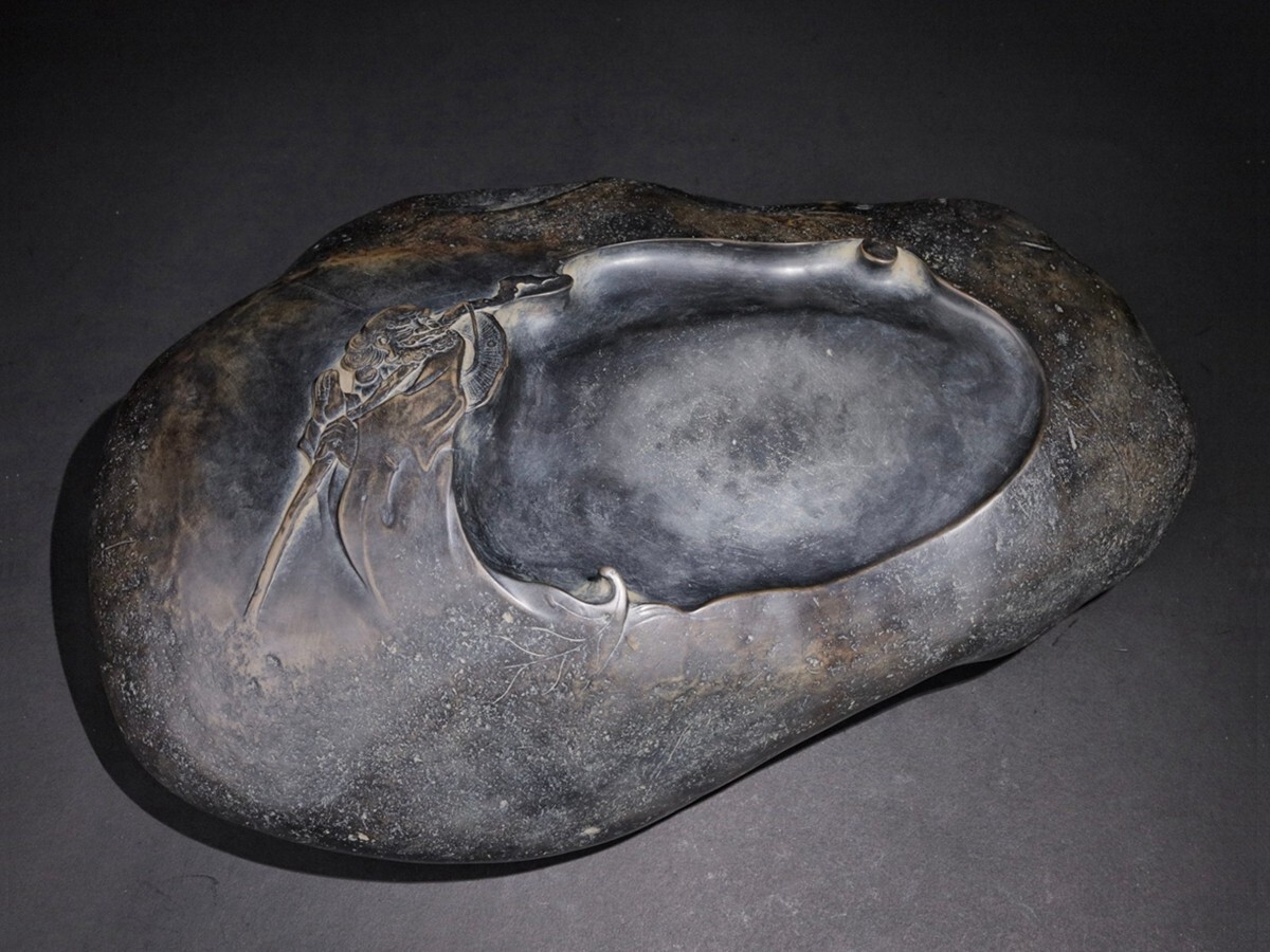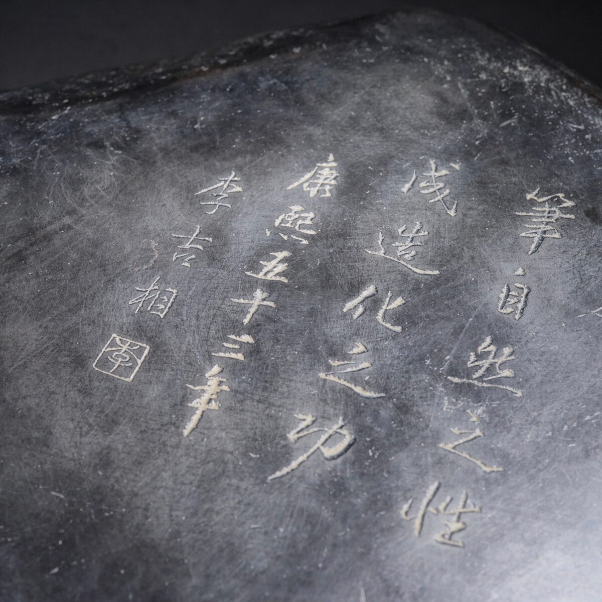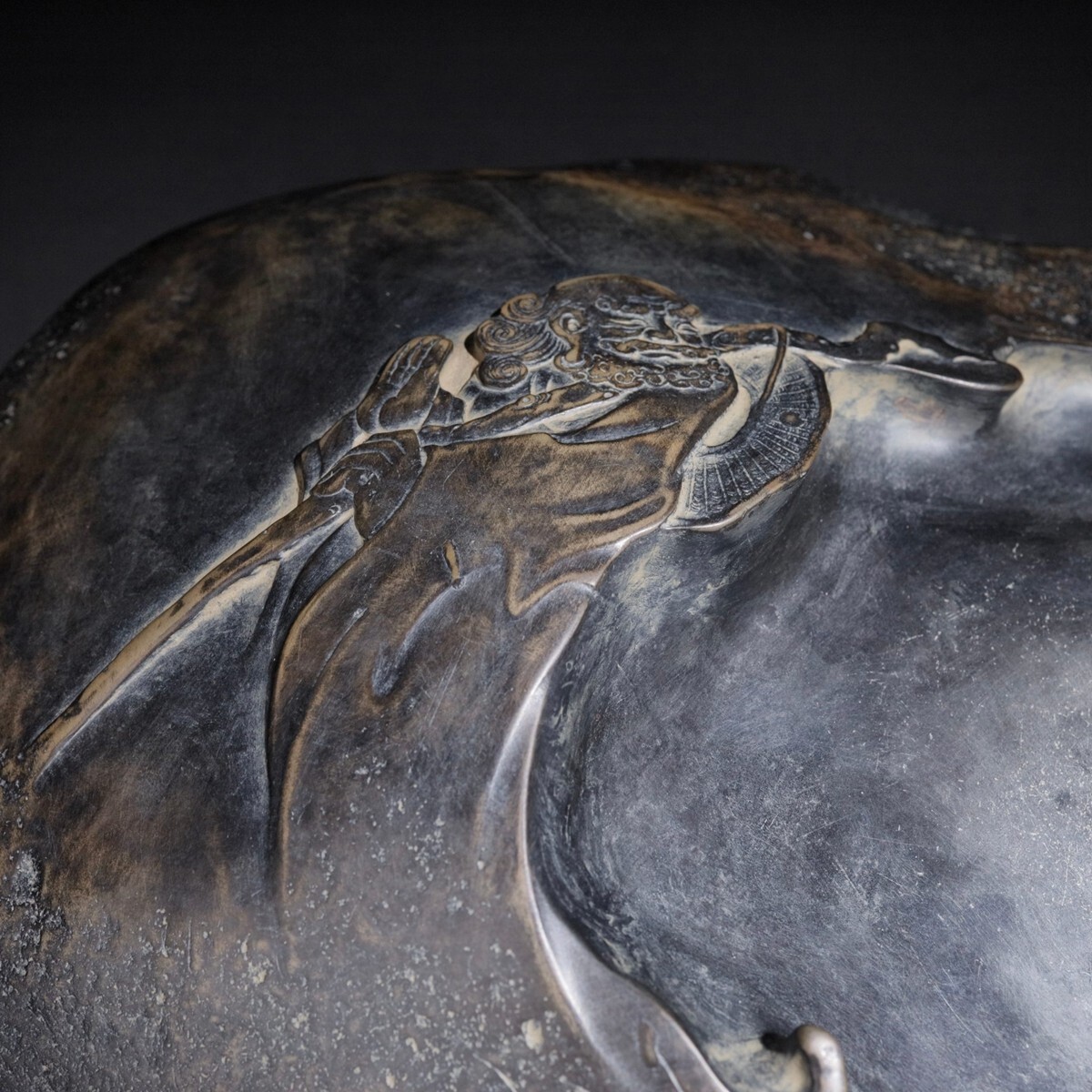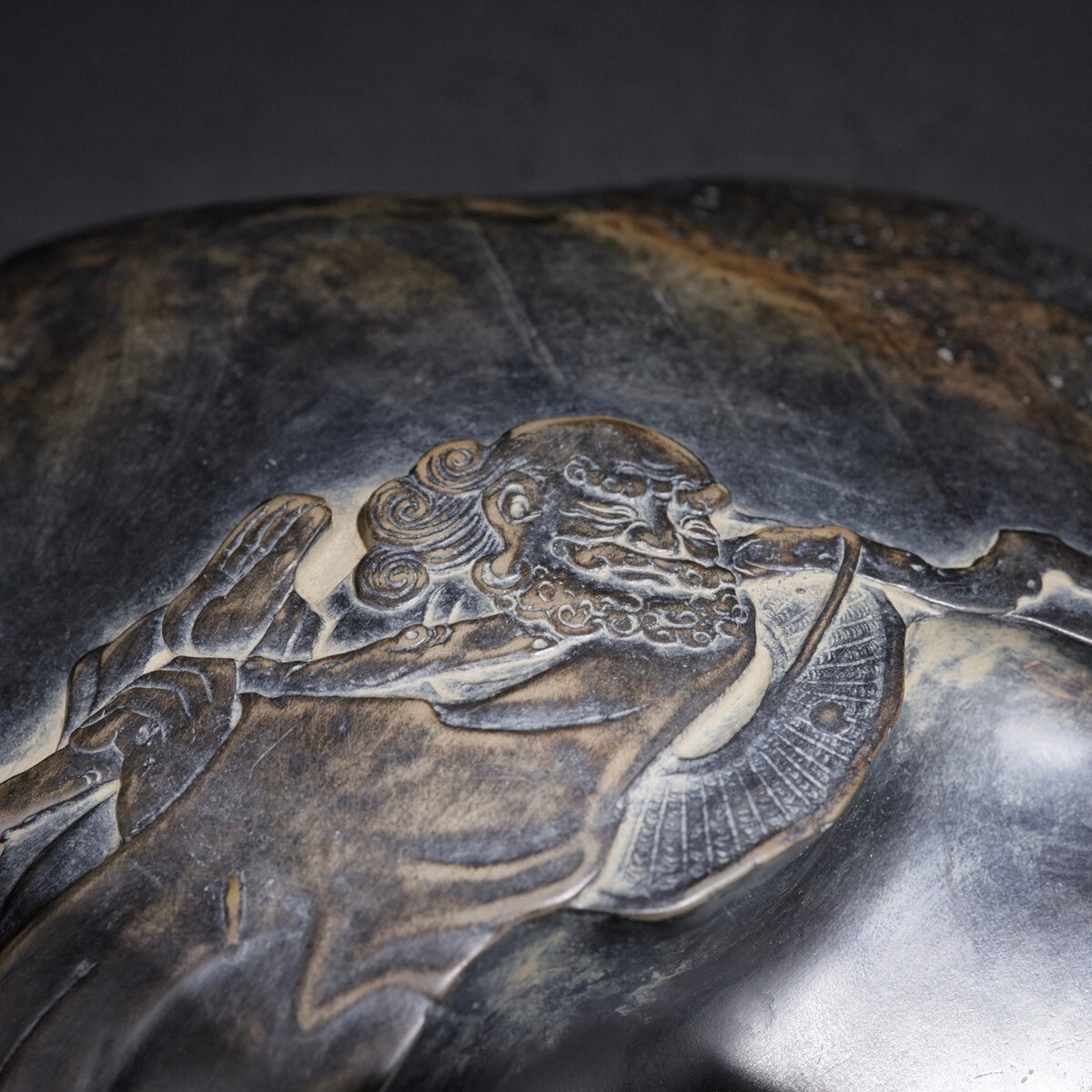 時代物 金皮歙石浮彫 達摩文房歙硯 李吉相銘【仁】手彫り 文房具 書道具 中国古硯 蔵出 骨董