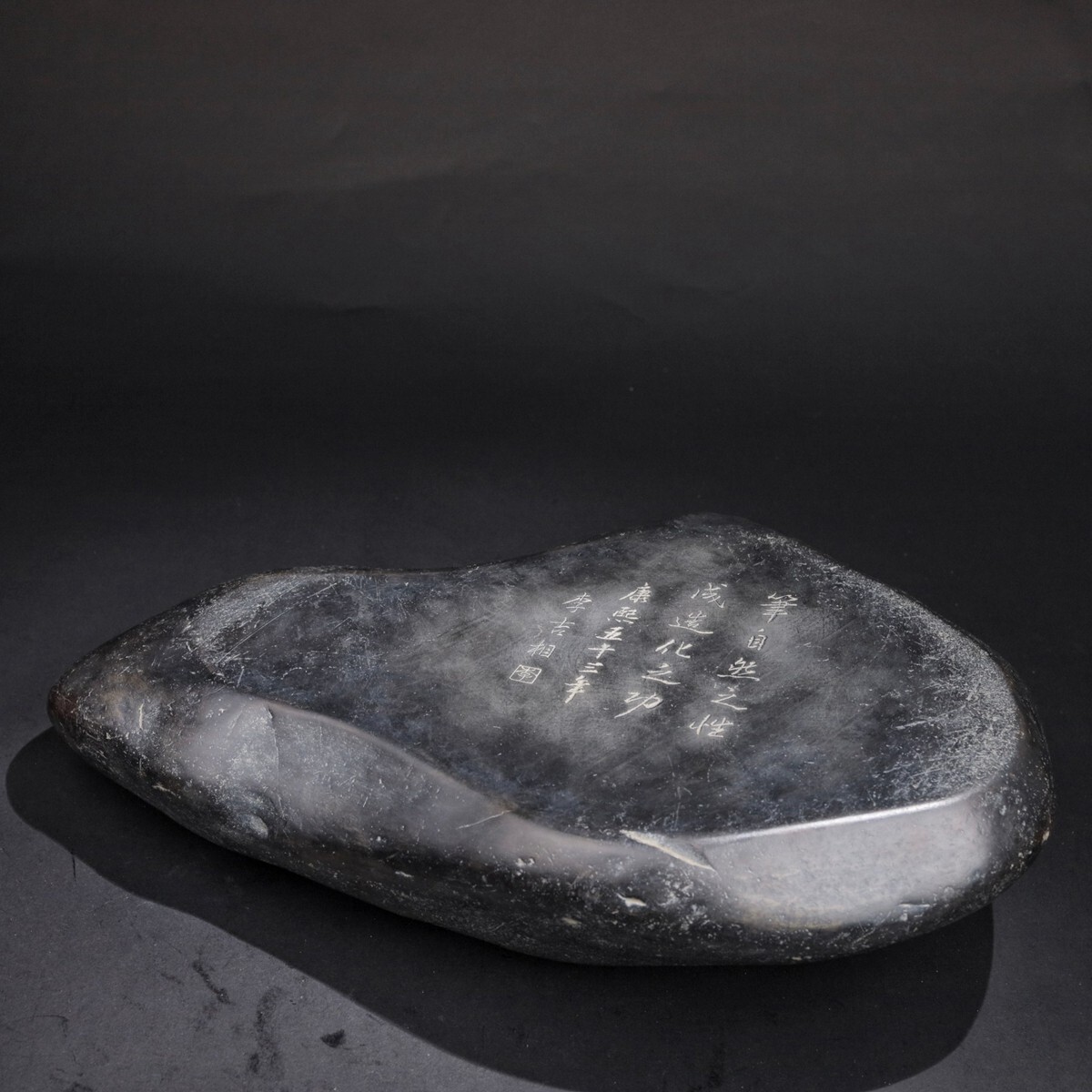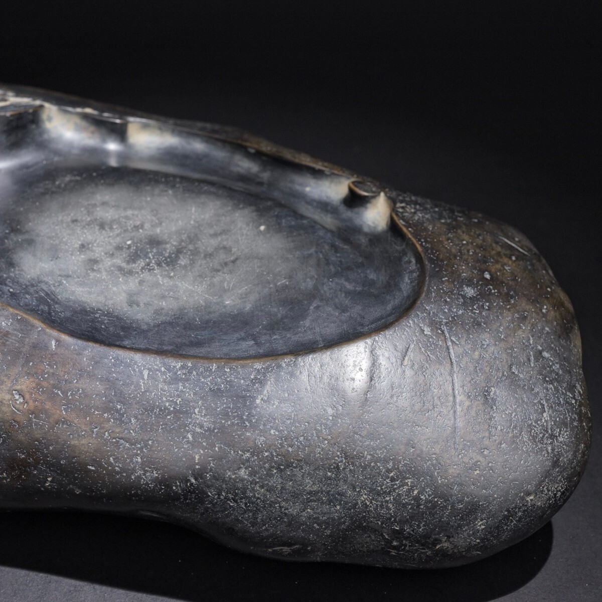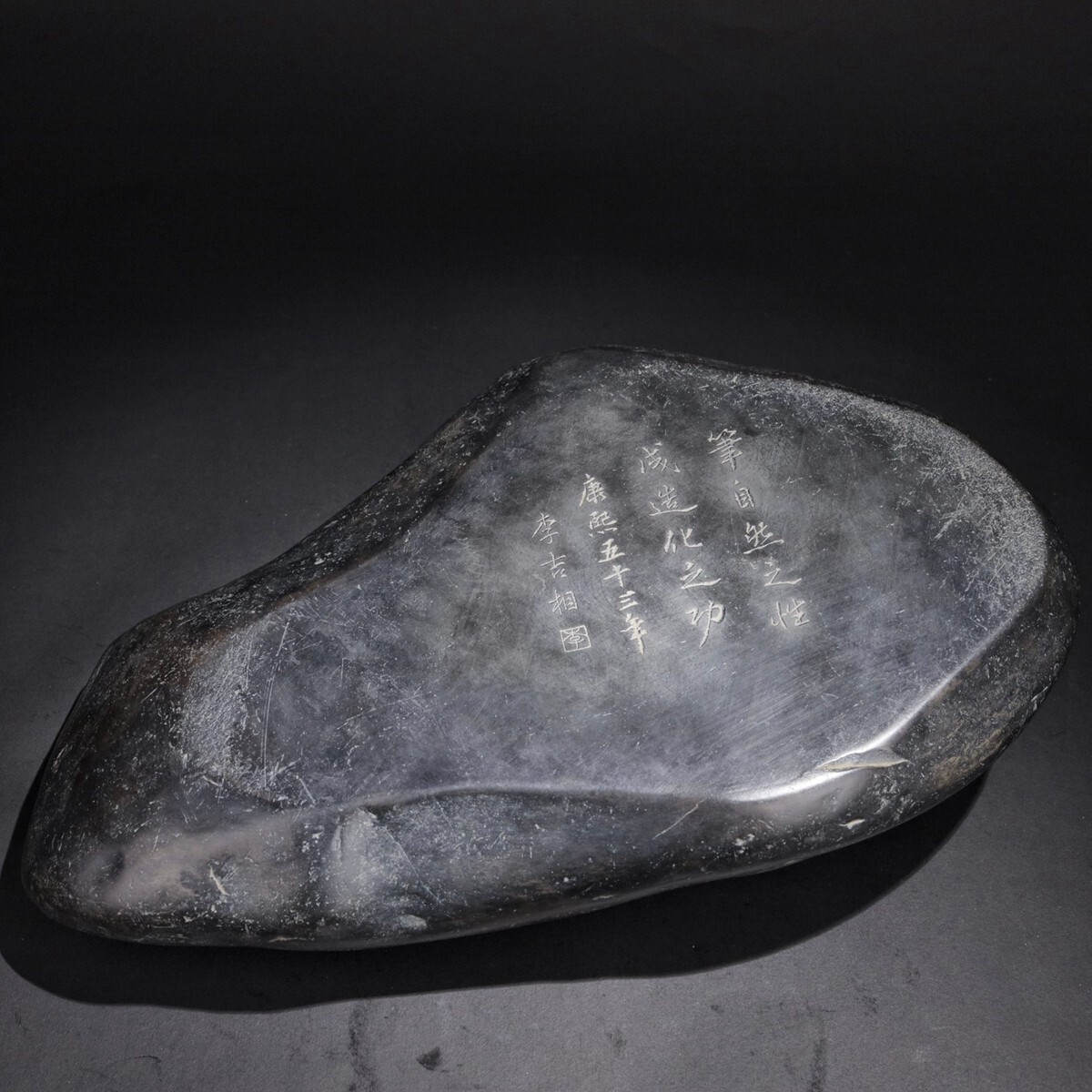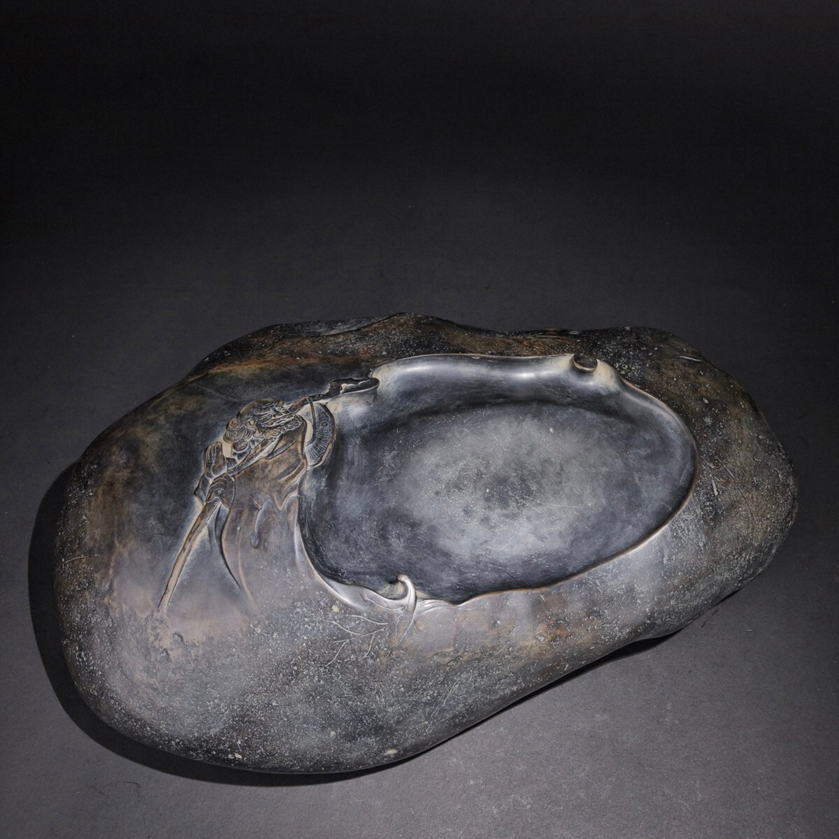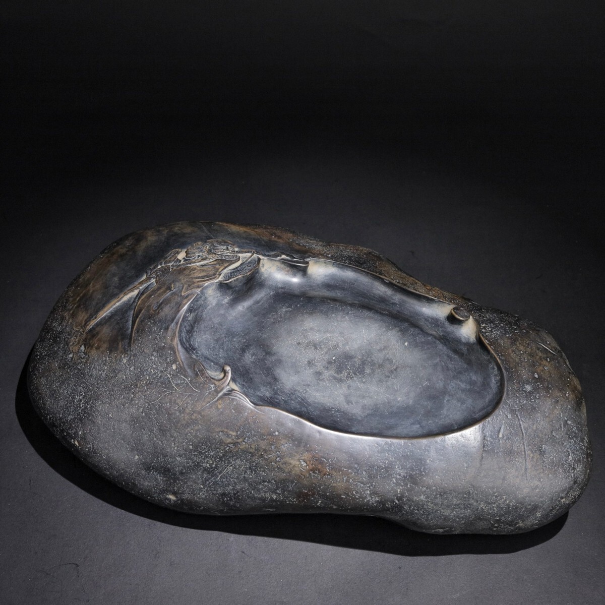 時代物 金皮歙石浮彫 達摩文房歙硯 李吉相銘【仁】手彫り 文房具 書道具 中国古硯 蔵出 骨董