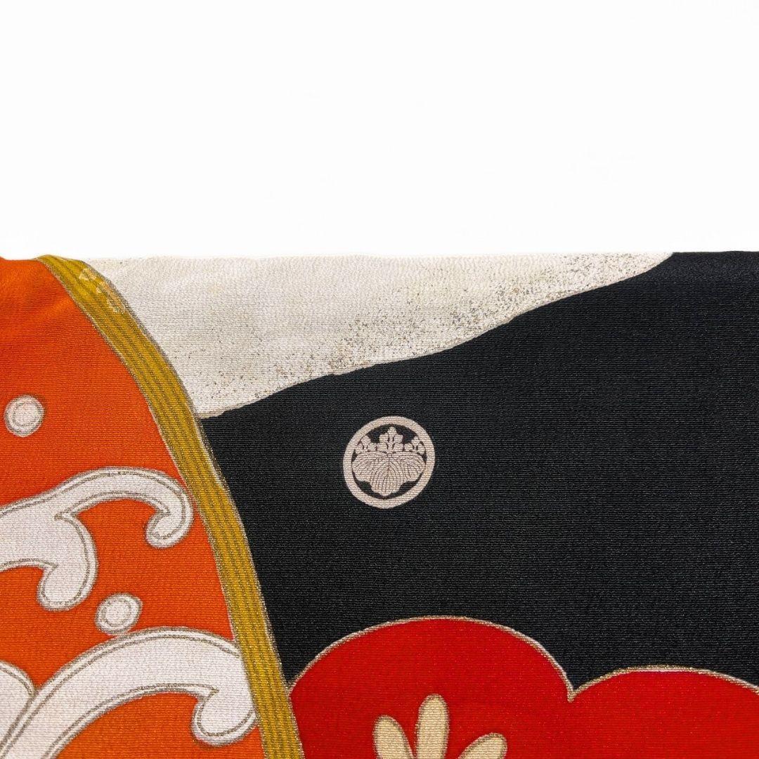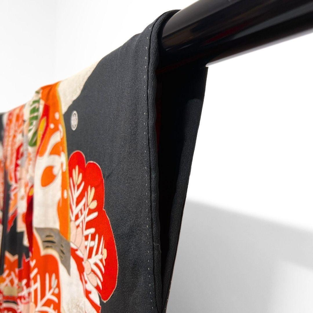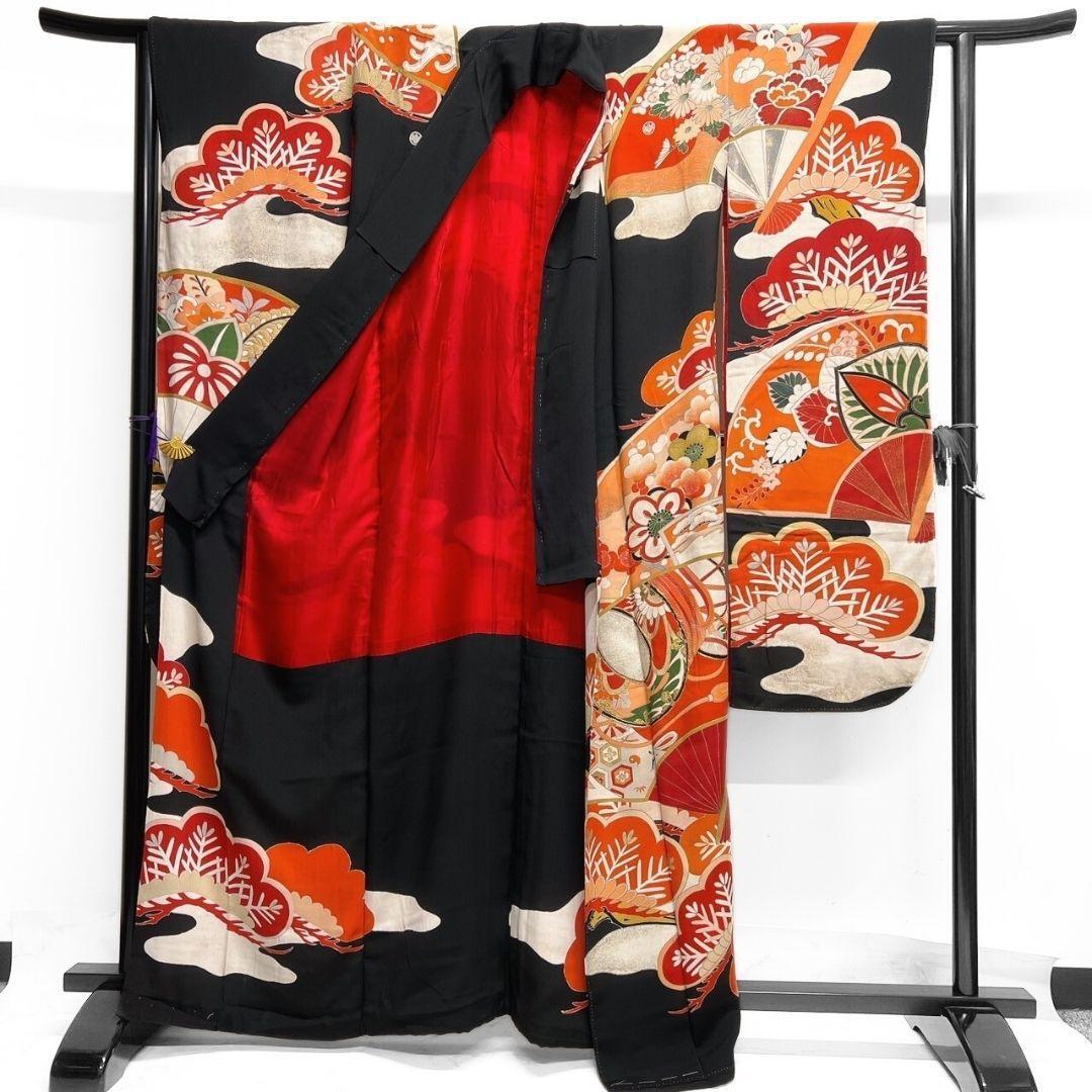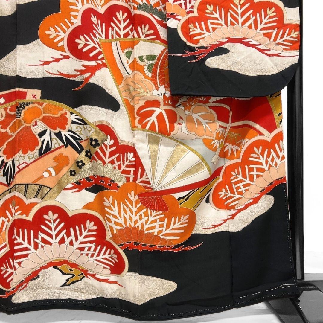 松竹梅や扇、鼓がアンティークながらの華やかなデザインで描かれた一着です。