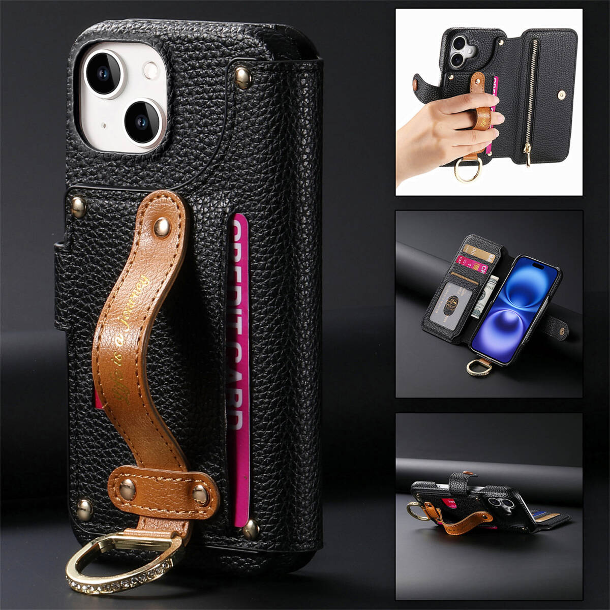 ブラック iPhone14用ケース 手帳型 RFID磁気防止 スキミング防止 カードポケット 落ち着いた色 横置き機能 高級PU 気質 全面保護