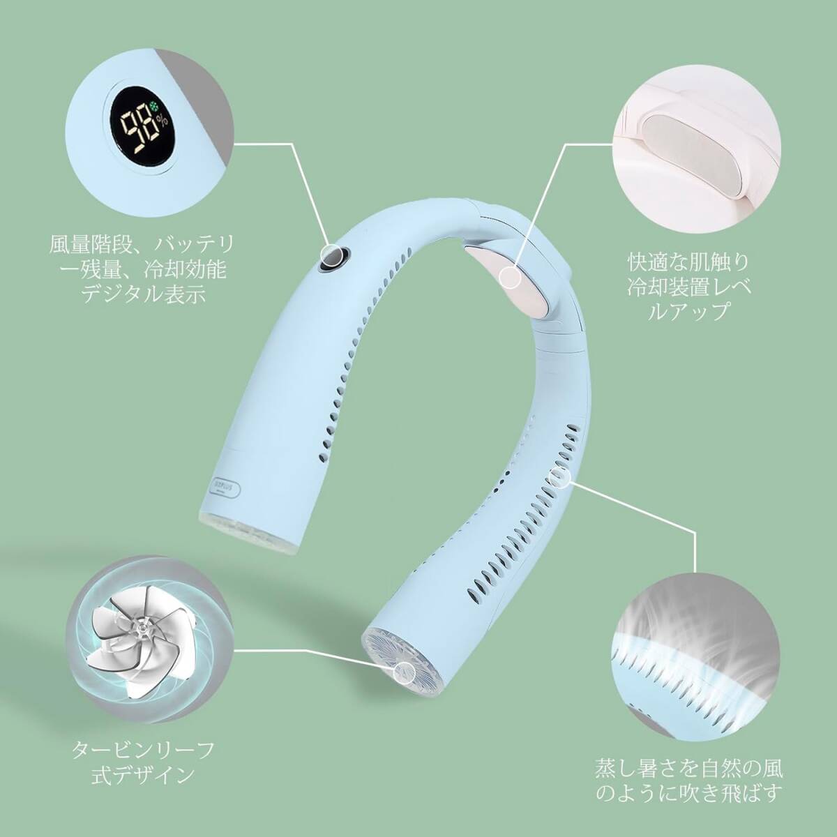 【特殊デザイン&持ち運び便利】ネッククーラーの 特殊デザインは飛行機のタービンリーフの設計を採用して、風量が従来より倍増! 首に掛けるだけで、両手を解放、暑い夏を乗り切ります。