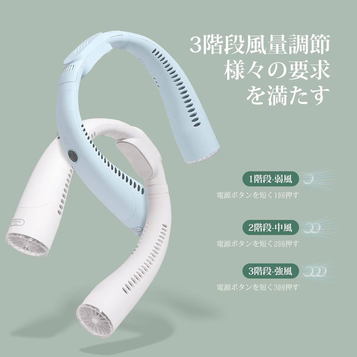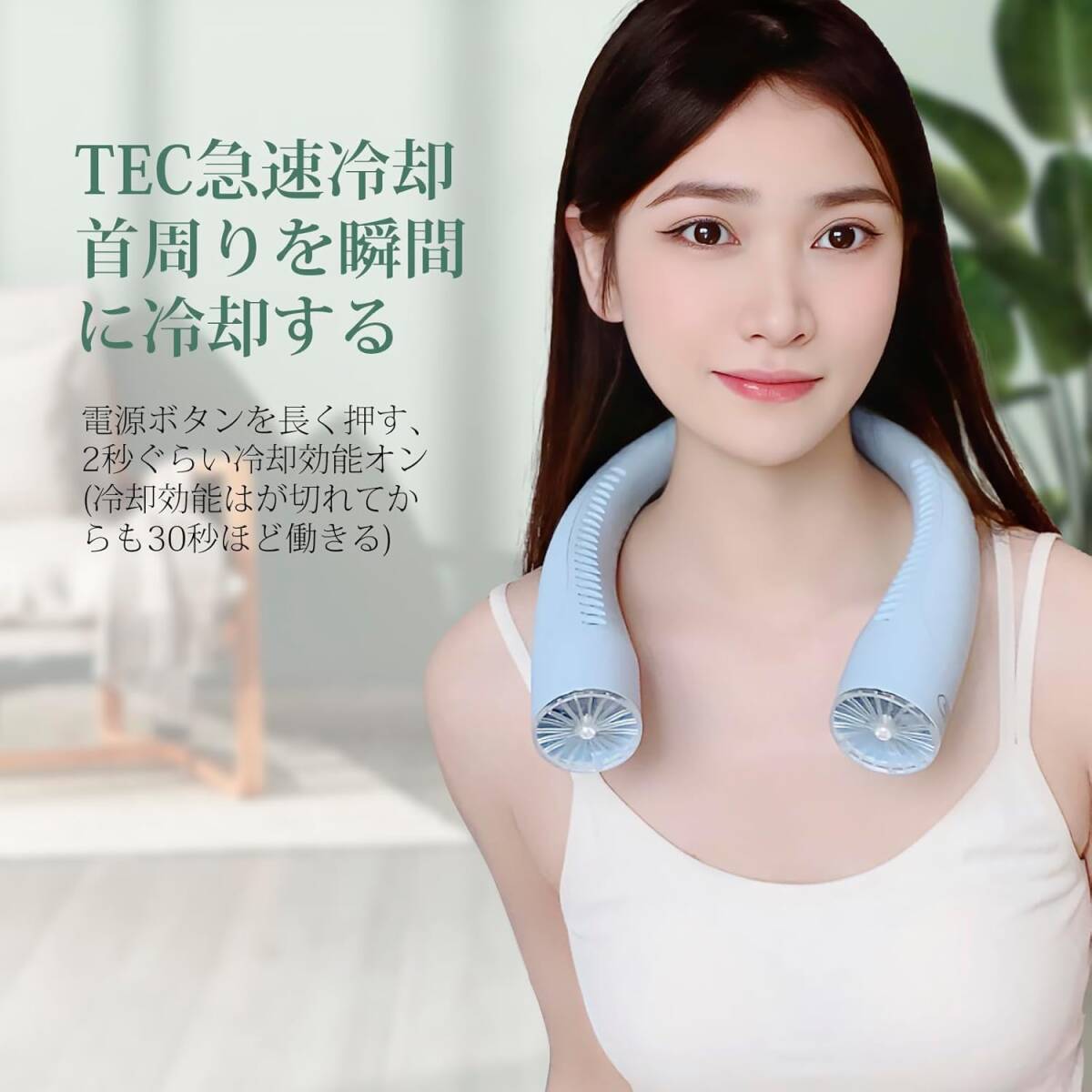 【3段階風量調節&TEC冷却】首掛け扇風機の風量は弱風・中風・強風の3段階から選択可能で、電源ボタンを繰り返し押すだけで、適切な風量に切り替わります。電源ボタンを長押しで冷却効能オン。冷却効能はオフにしても30秒ほど働きます。