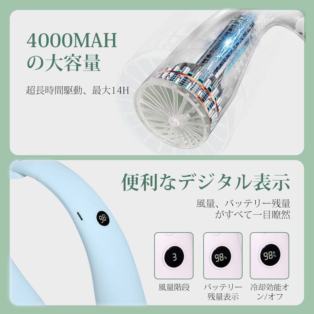 【4000mAh大容量&LED画面表示】4000mAhの大容量バッテリーを搭載しているため長時間運転が可能で、風量も豊富です。TYPE-Cポートから充電することができます。風量階段、バッテリー残量、それと冷却効能は、本体に搭載されたディスプレイで確認することができます。
