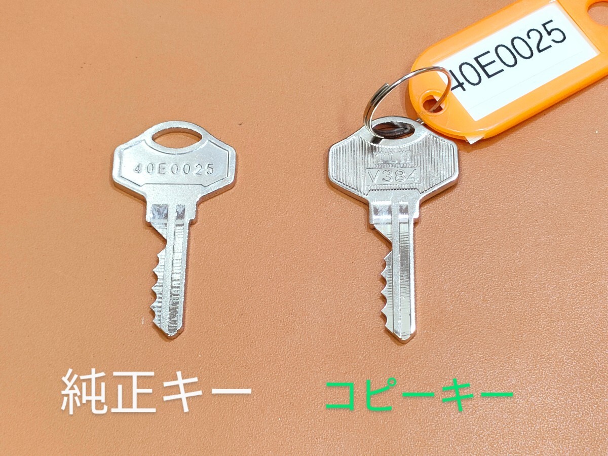 40E0025の合鍵1本と、カギ番号が記載したキーホルダー付き(※色はお任せ)。
