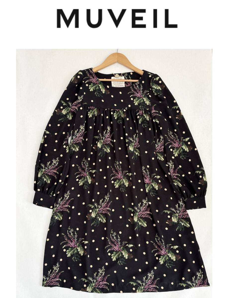 美品 ミュベール ワンピース ブラック 花柄 膝丈 長袖 ドレス muveil 黒 しわになりにくい生地