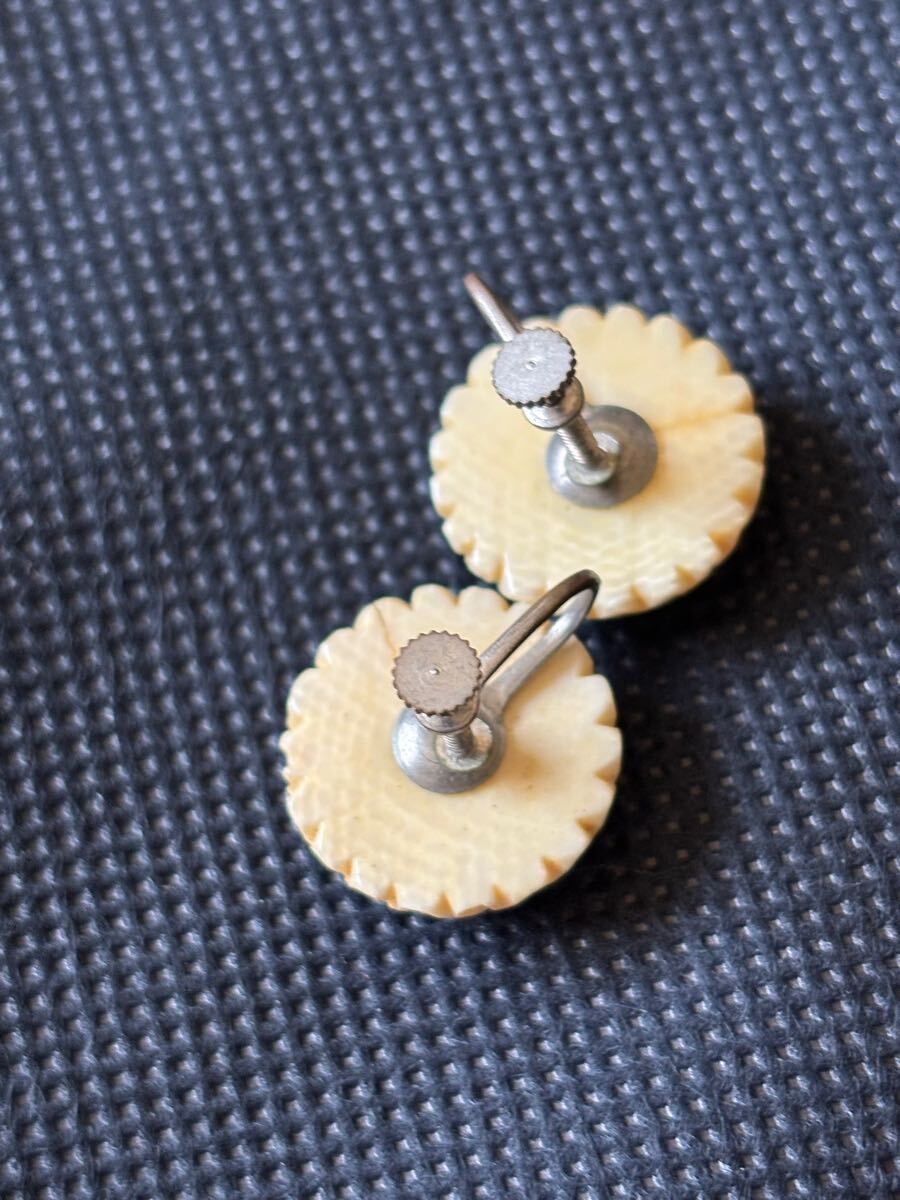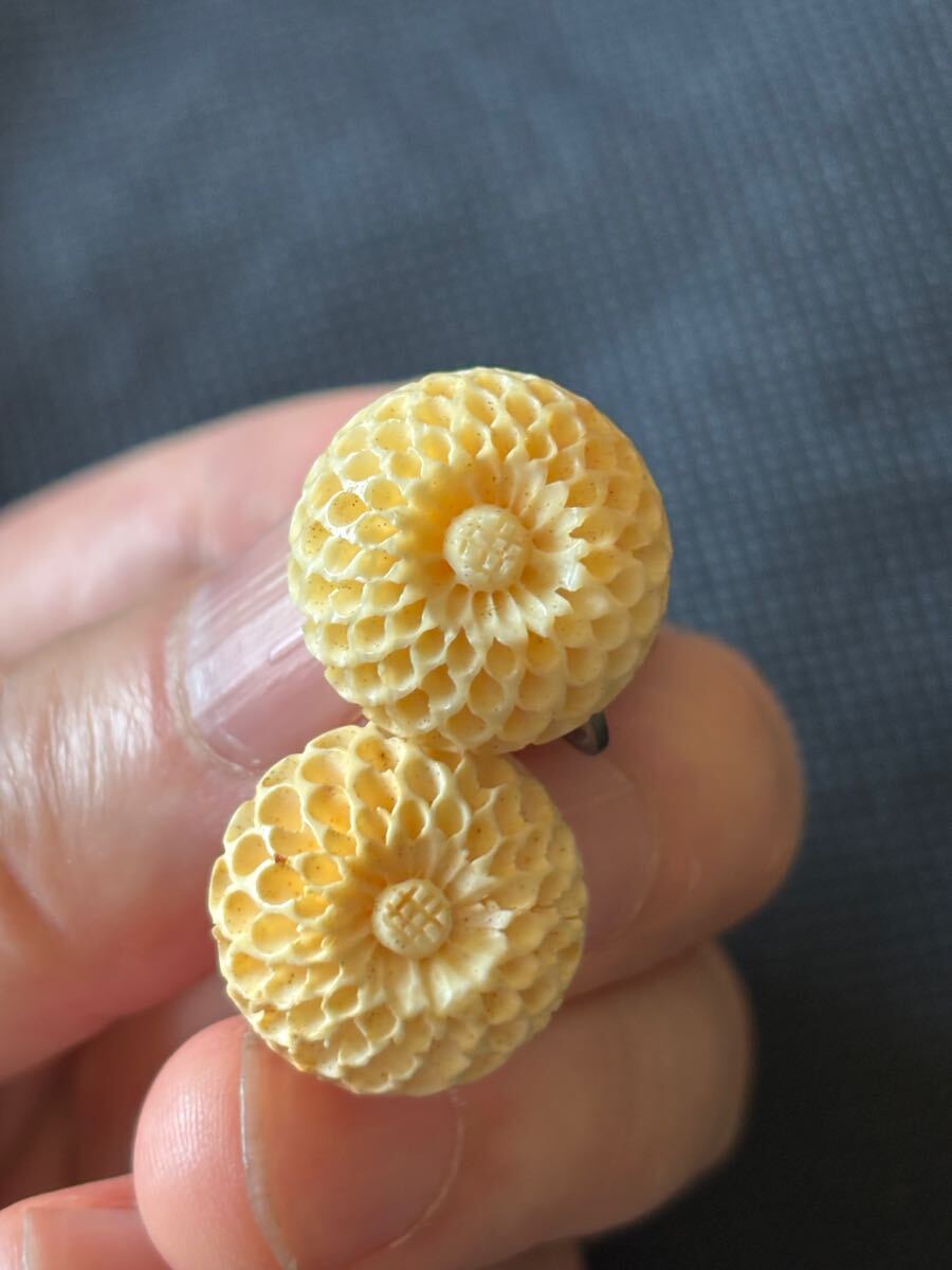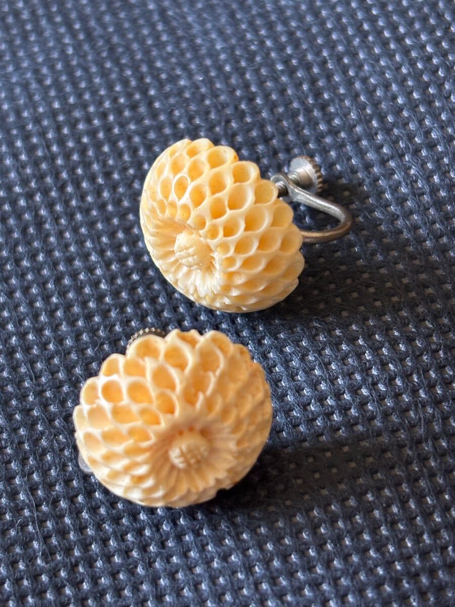 クリーム色の花形イヤリング、軽量で着け心地良好。