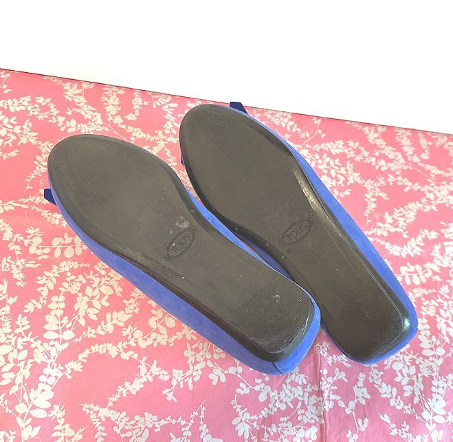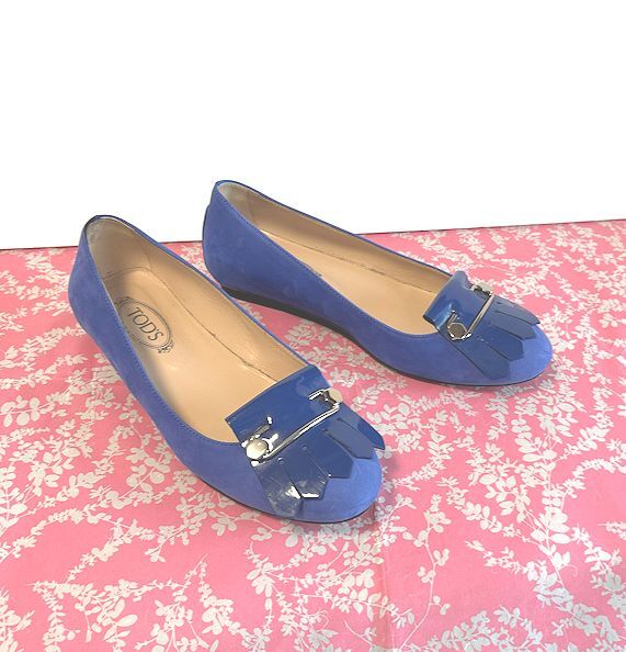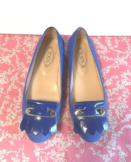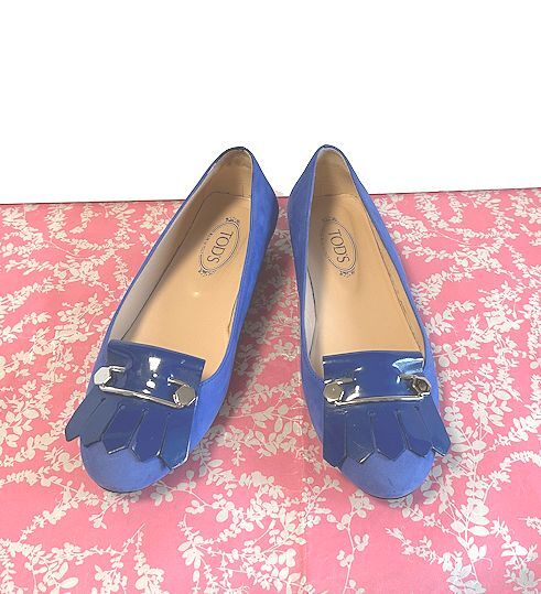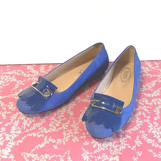 値下★TOD'S トッズ★レザー・フリンジ・シルバーピン・バレエ・フラット・シューズ・パンプス・ブルー・35.5★美品