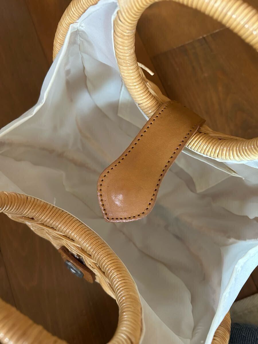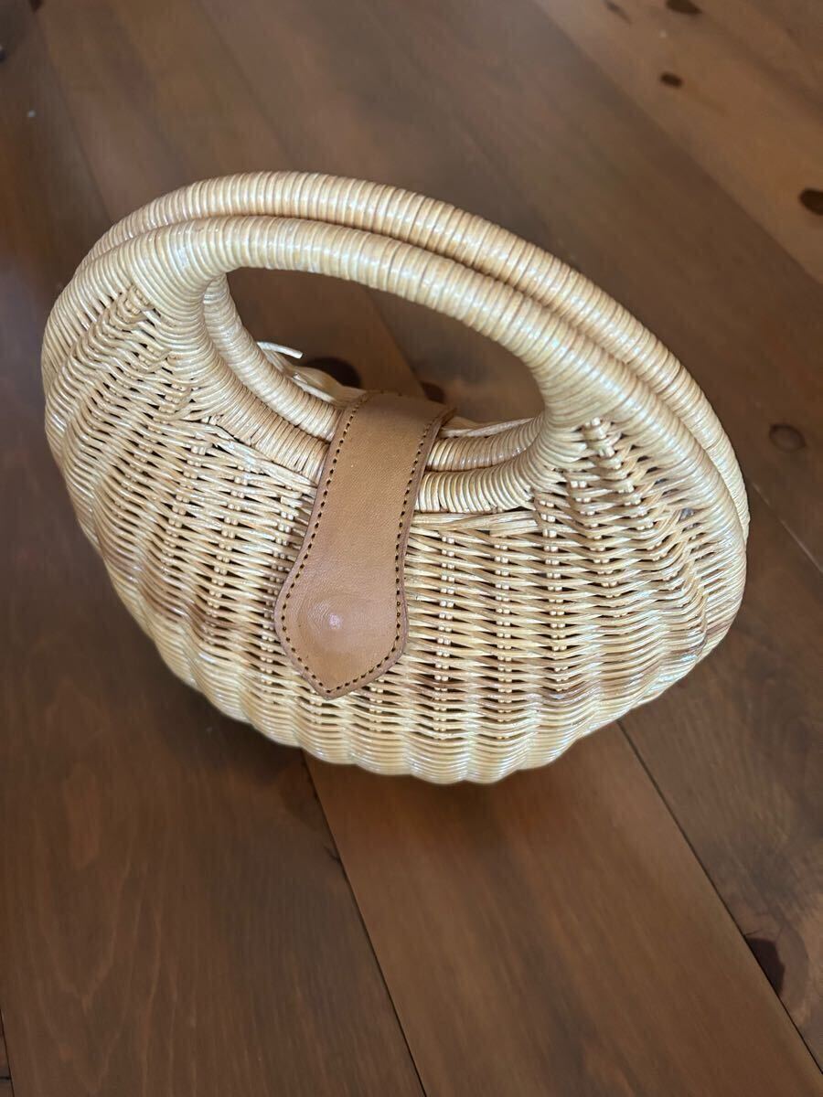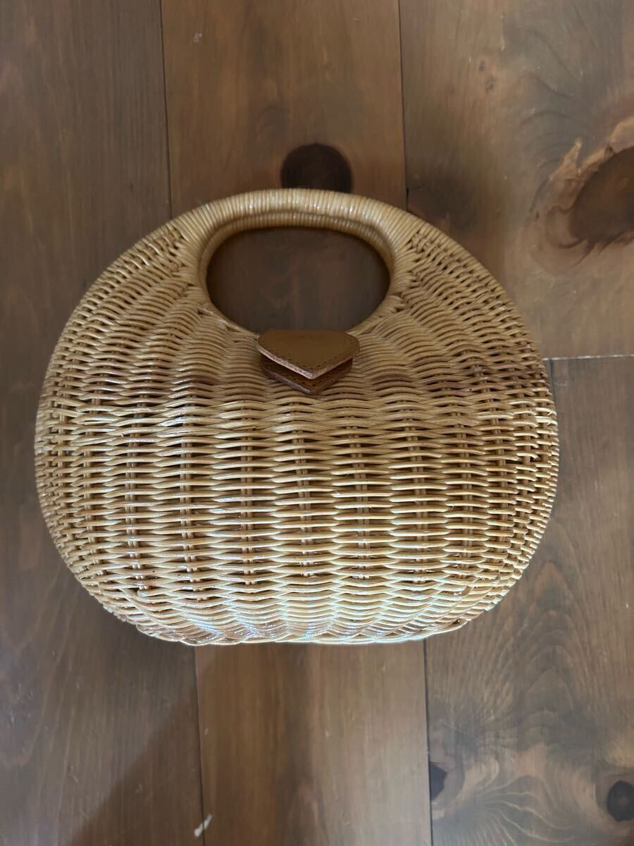 コロンとした可愛い形のカゴバックです。サイズは手提げ部分を含め縦約21センチ横約22センチです。マグネットで留めるタイプです。ノークレーム・ノーリターンでお願い致します。