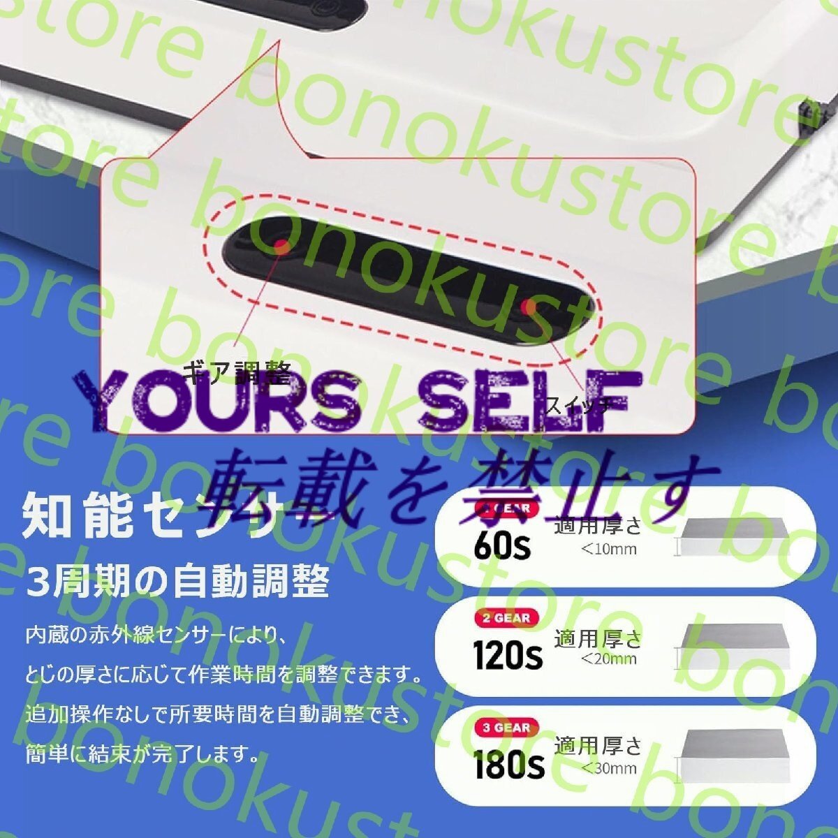 【自動調整時間】- サーマル製本機は3つのギアを使用して、製本の厚さに応じて必要な時間を自動的に調整するため、温度持続時間の選択について心配する必要はありません。 <10mm:60秒 /<20mm:120秒 /<30mm:180秒