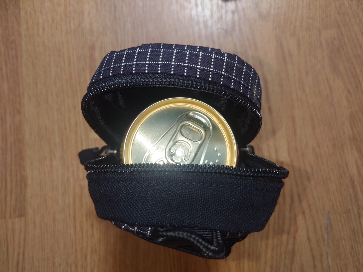 サイズは平置きの状態で、縦約15.5cmX横約6.5cmX幅約4.5cm、重量約79gです。サイズ表記ありませんが、昔のMサイズに相当します。350ml缶が一本入るイメージです。