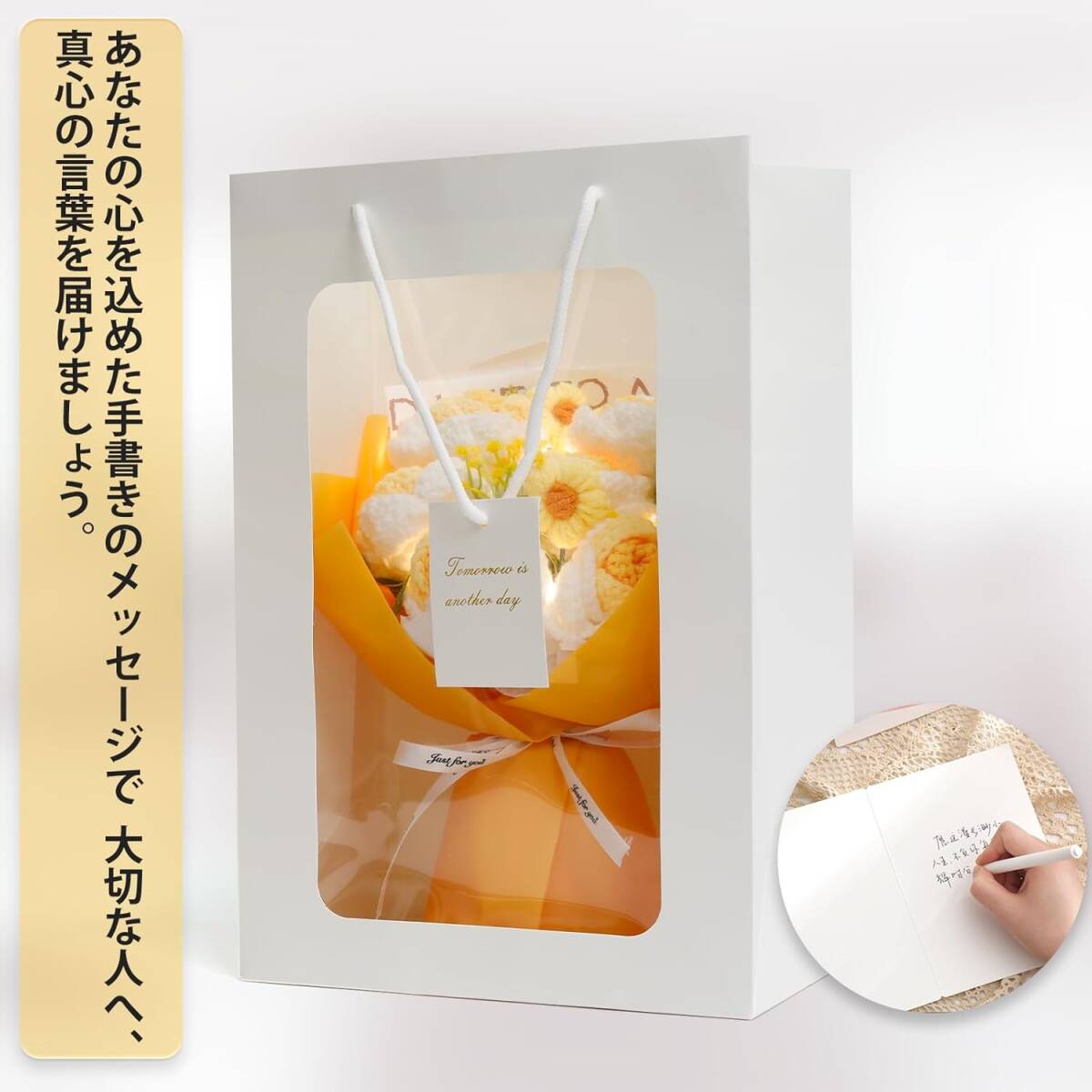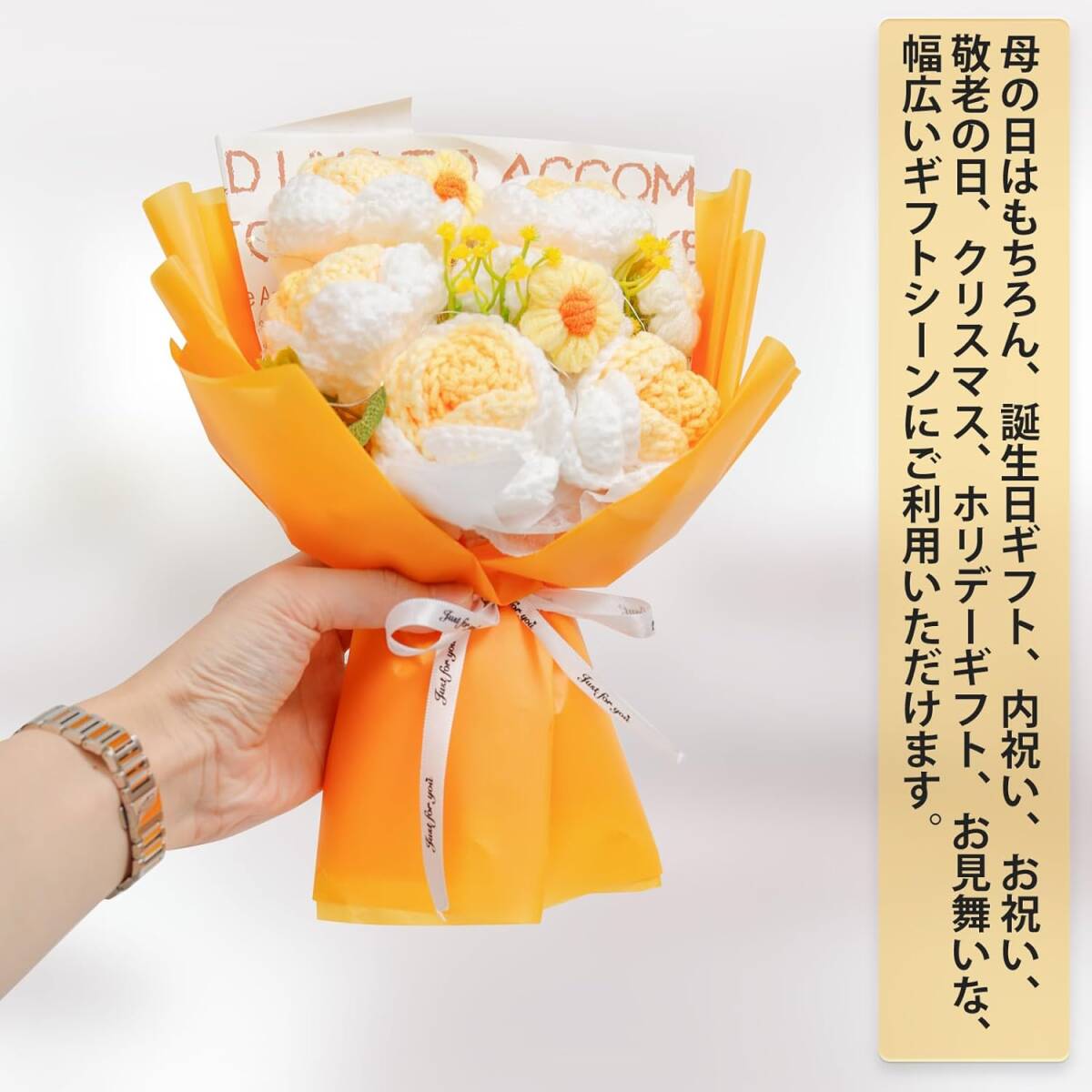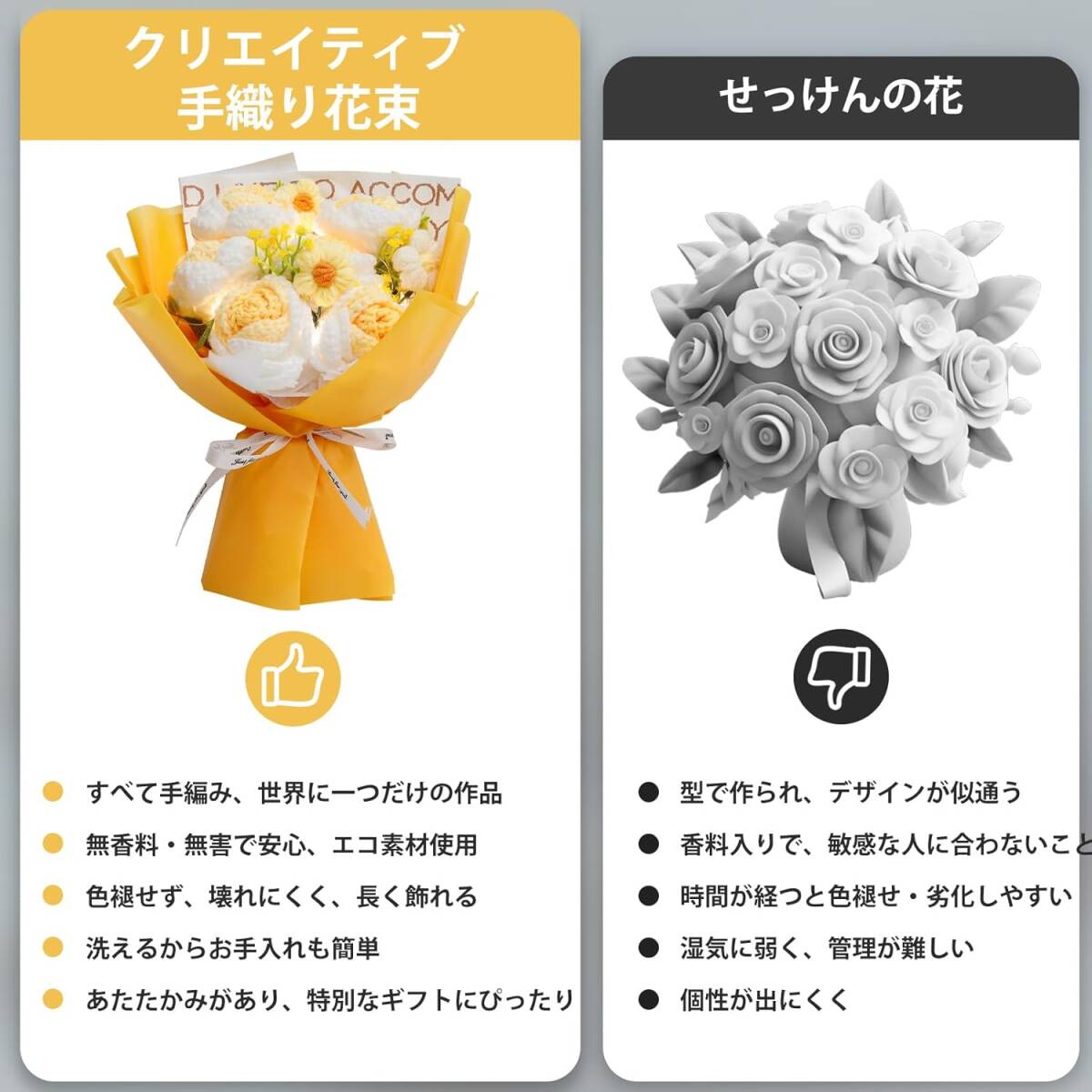 • 【無香料・手作り・洗える安心の花束】一般的な石鹸花は香料付きで敏感な方には不向き。当店の手編み花はすべて無香料・安心素材を使用。色褪せにくく、お手入れ簡単で長持ちします。贈り物にも、ご自宅のインテリアにもぴったりな優しさと温もりのあるお花です。