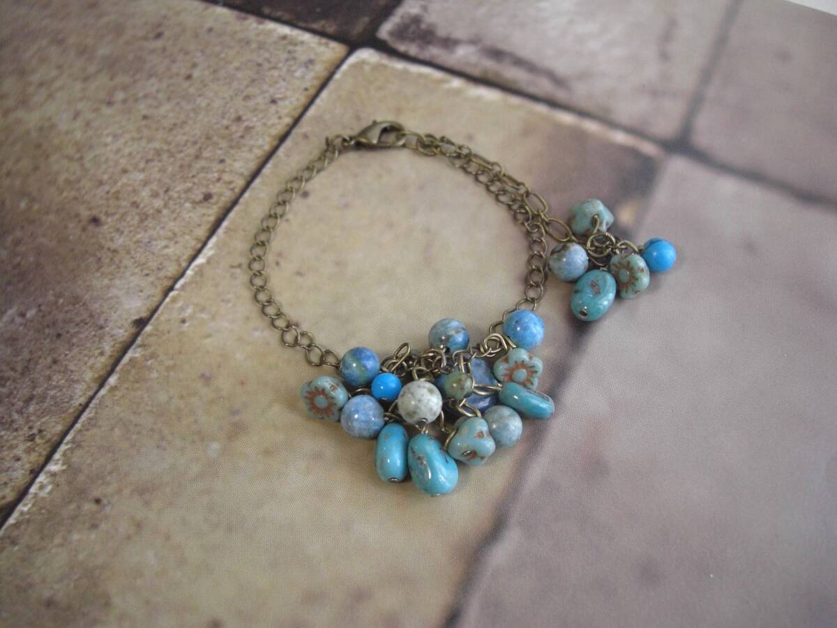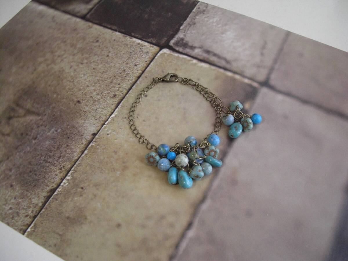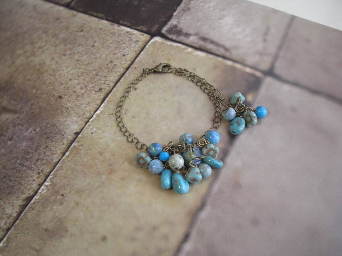 さりげなく着ける楽しみ‥シリーズです♪可憐な青色を集めて・・ターコイズやブルーオパール、デニムラピスなど色合いの違うブルーを集めてブーケのようにまとめました♪4ミリから10ミリ位までの丸玉やミニタンブルやコインなどデザイン違い、大きさ違いです♪チェコビーズのお花を添えて可憐な表情です♪長さは全長22センチ位で調節自由です♪お揃いのネックレスやピアスも出品しています♪シンプルで飽きのこないいつまでも着けられるデザインを考えて作りました!ハンドメイドをご理解頂いてノークレーム、ノーリターンでお願いします