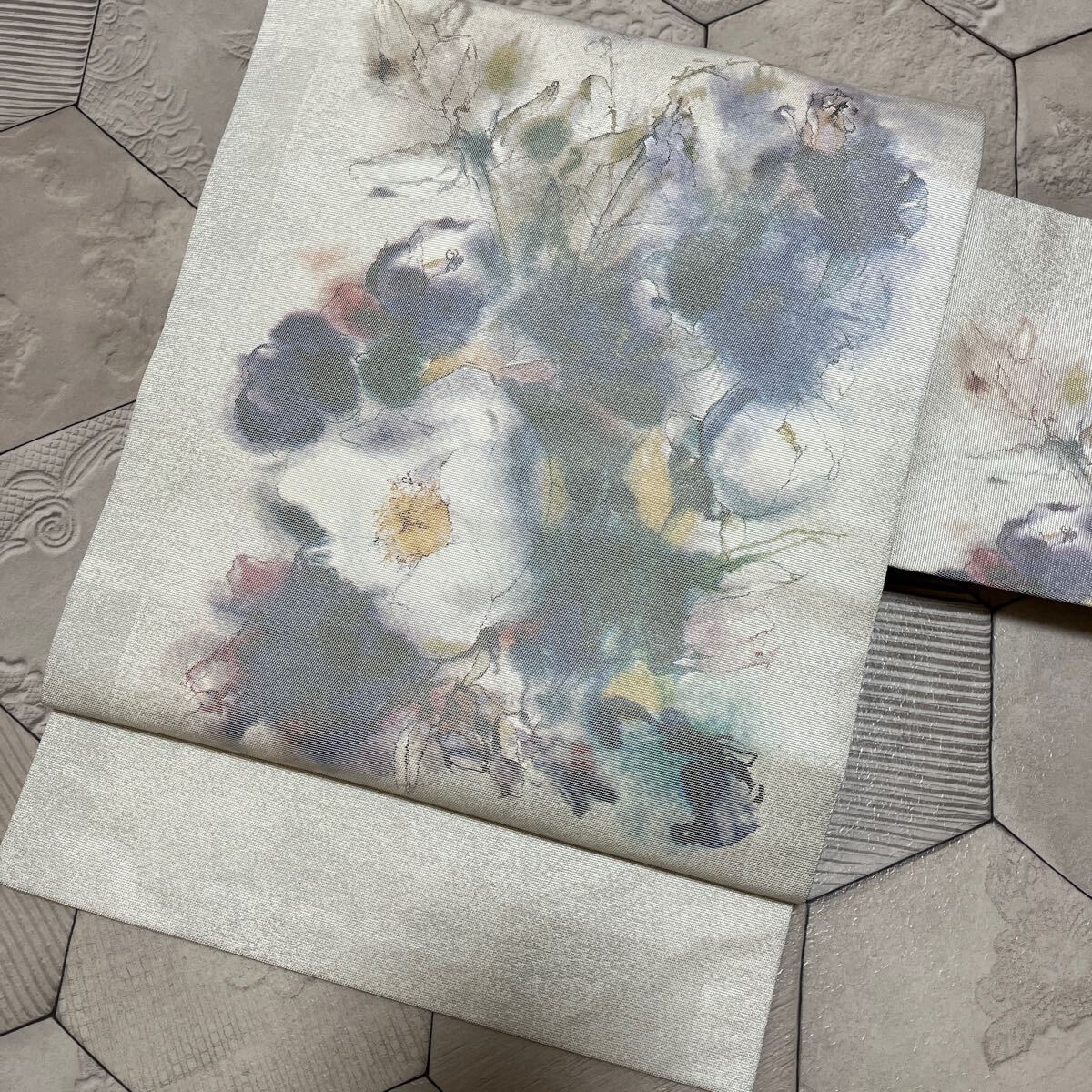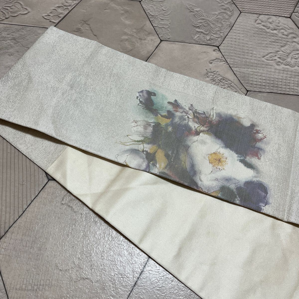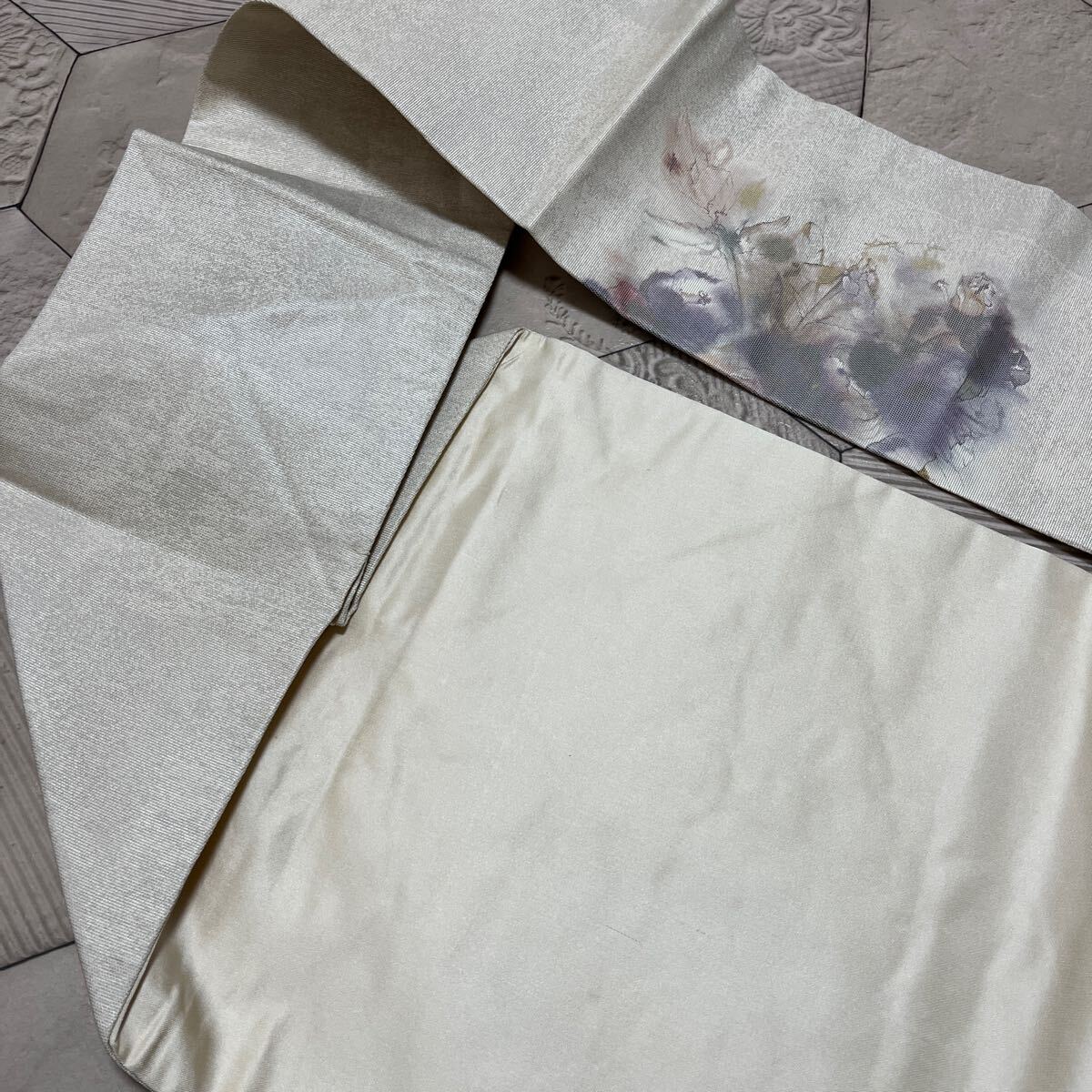 アンティーク 名古屋帯 着物 白地 花 絵画 ぼかし 清楚 昭和レトロ 大正ロマン モダン 和洋折衷コーデ リメイク え28-18w