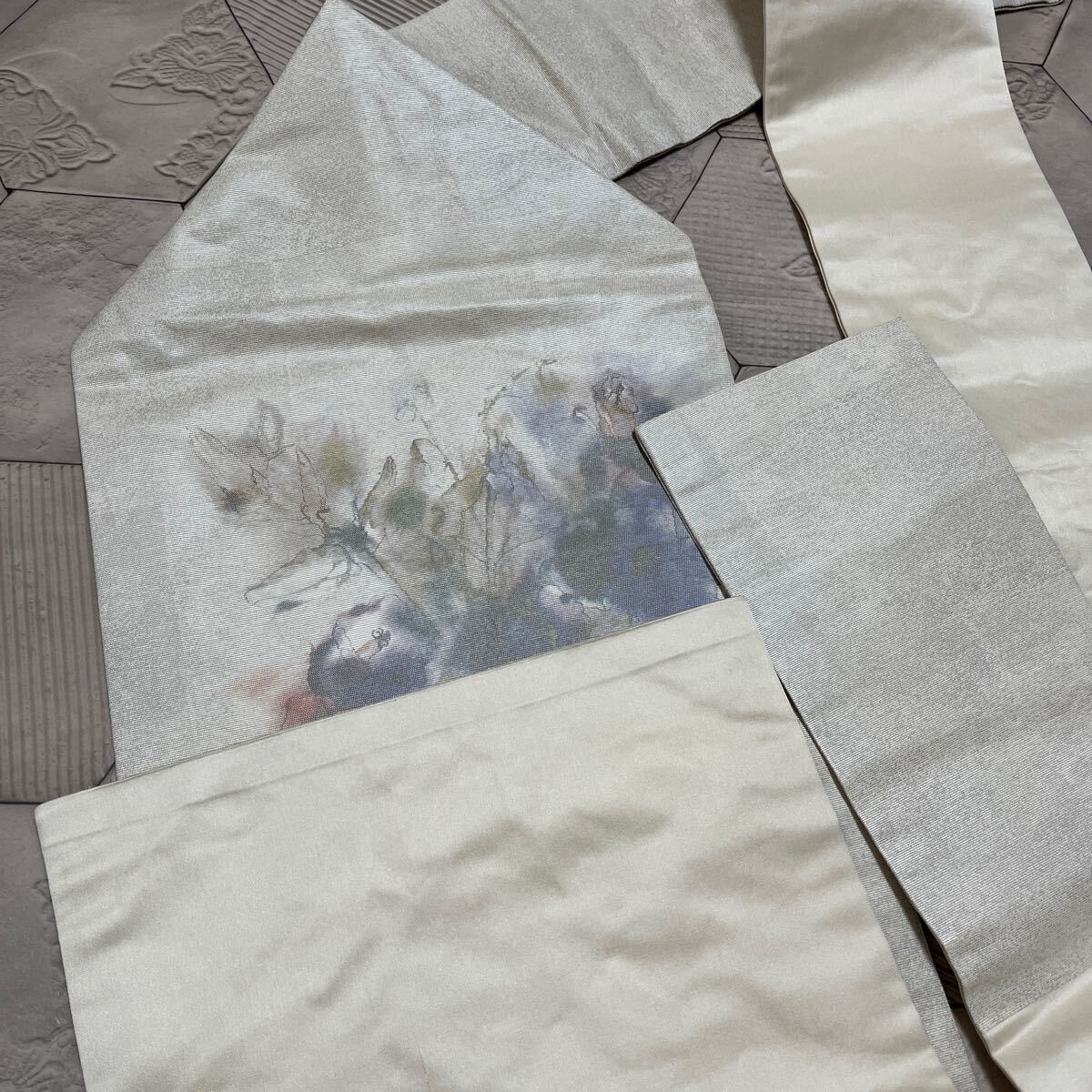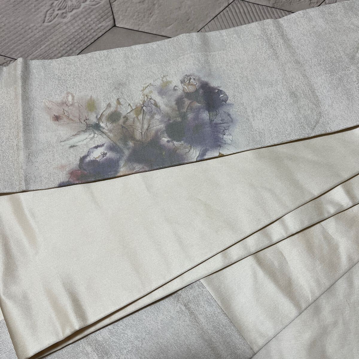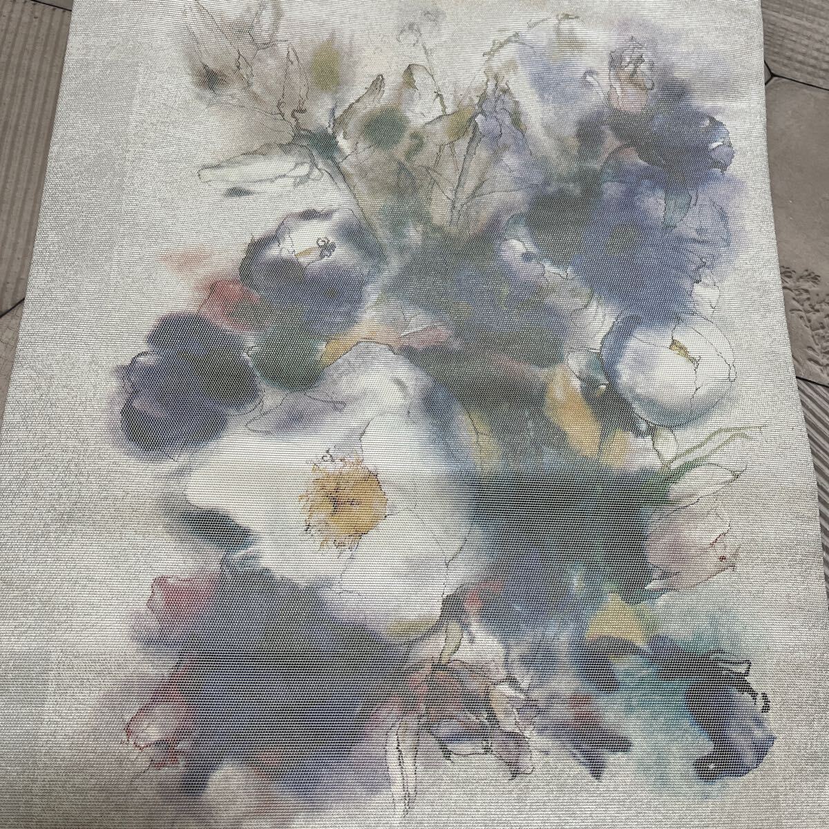 アンティーク 名古屋帯 着物 白地 花 絵画 ぼかし 清楚 昭和レトロ 大正ロマン モダン 和洋折衷コーデ リメイク え28-18w