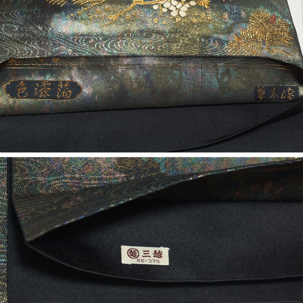 | 商品 説明 | 薄柿色系のちりめん地にぼかしに枝花模様が染められた付下げ訪問着と、黒色系のしっとりとした地に瀞金ぼかしに流水や松葉、小花、切れ箔などの模様が織られた袋帯の2点セットです。 帯は草木染 色漆箔使用、三越扱い、垂れ先中に銘、タグが付いております。 |