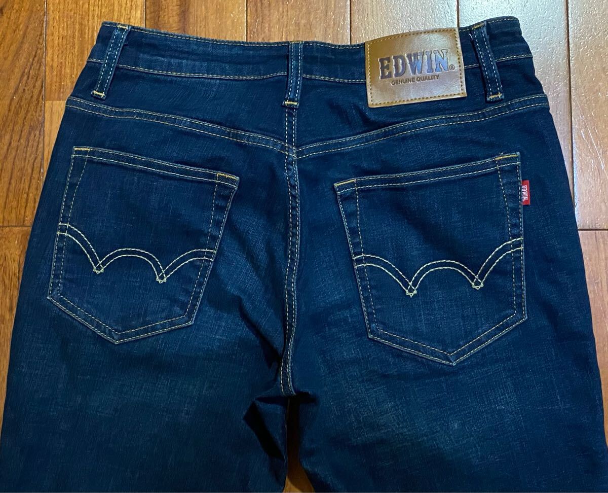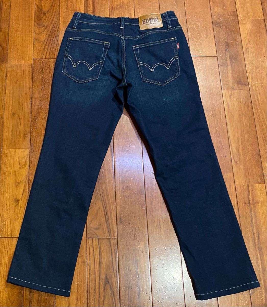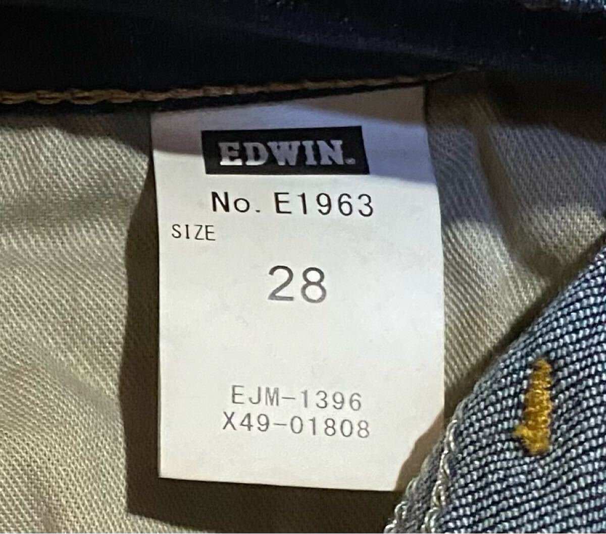 エドウィンのストレッチ テーパードデニム(ジーンズ)、No.E1963です。色はインディゴブルーです。USEDですが状態は良いです(10段階中8程度)。生地はストレッチ入りで綿72%、ポリエステル26%、ポリウレタン2%です。ジッパーフライです。正規品です((株)エドウイン、ベトナム製)。サイズはW28でウエストは重ねずに平置きで約77cm、ヒップ約100cm、股上約23cm、股下約70cm、股下15cmのふともも部分約51cm、裾まわり約37cm、重量約490gです。発送はゆうパケットポストになります。