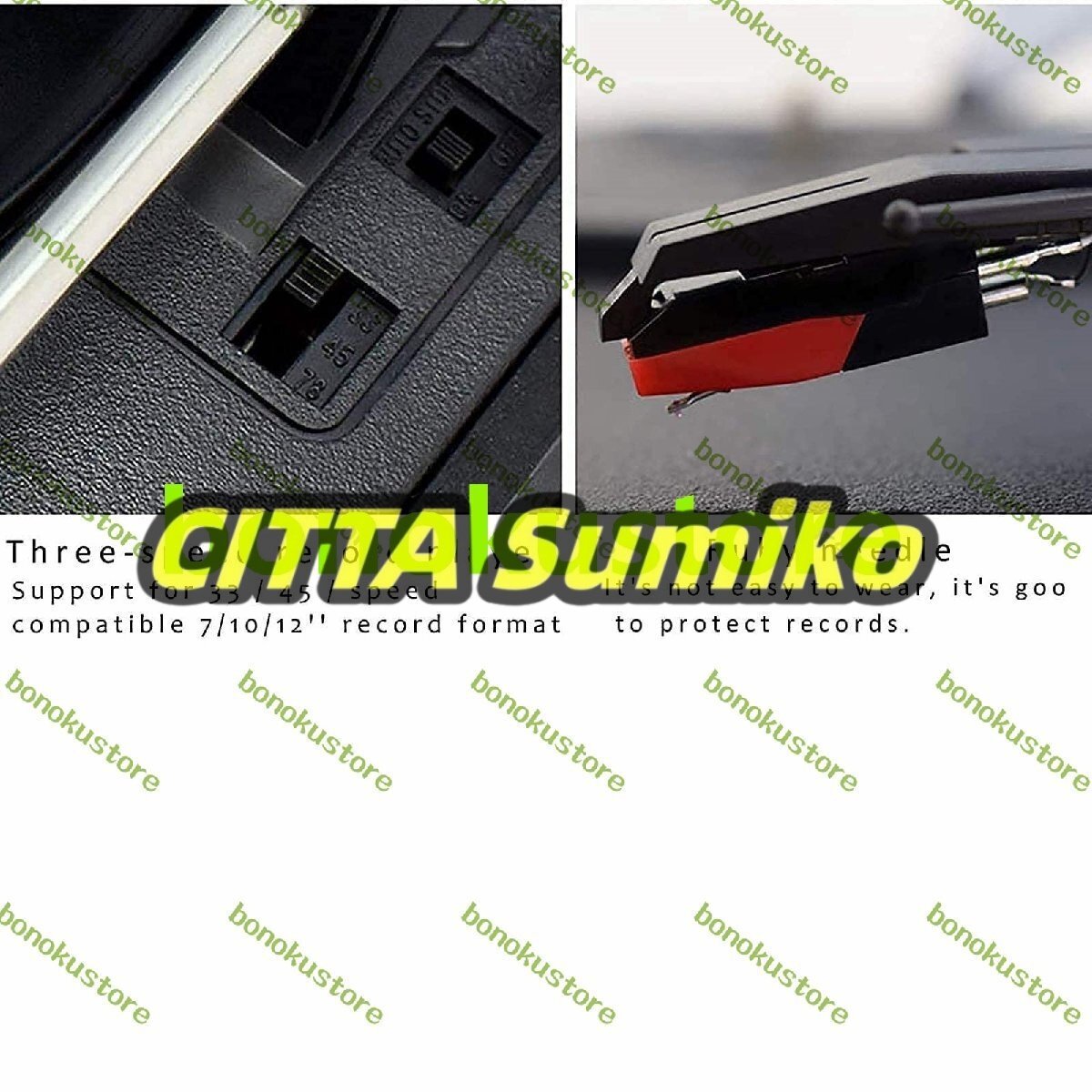 3 スピード レコード プレーヤー --- ベルト駆動のターンテーブルは、7、10、12 インチのサイズで 33、45 (45 RPM アダプターを含む) および 78 スピード RPM 録音を再生します。<br