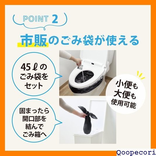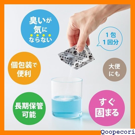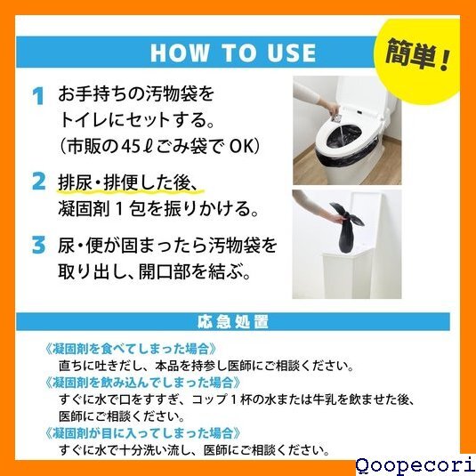 便器に市販のゴミ袋をセットして凝固剤を1回につき1包かけるだけ。すばやく固まる。※市販のゴミ袋(45L)で使える。