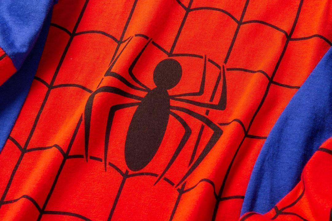 - Tシャツは赤地に黒のクモの巣模様、中央に黒いスパイダーマンのシンボルマークが配置されています。