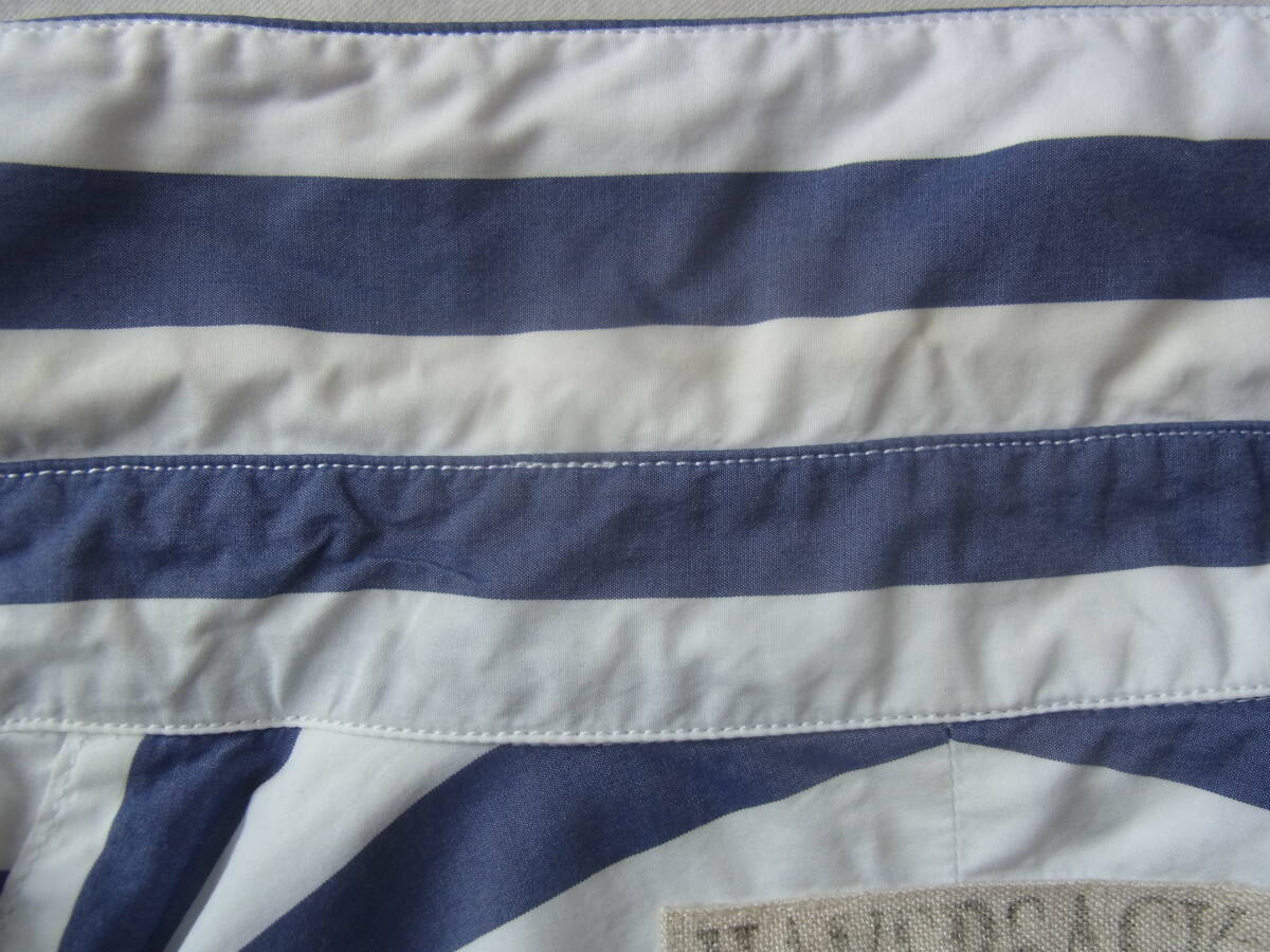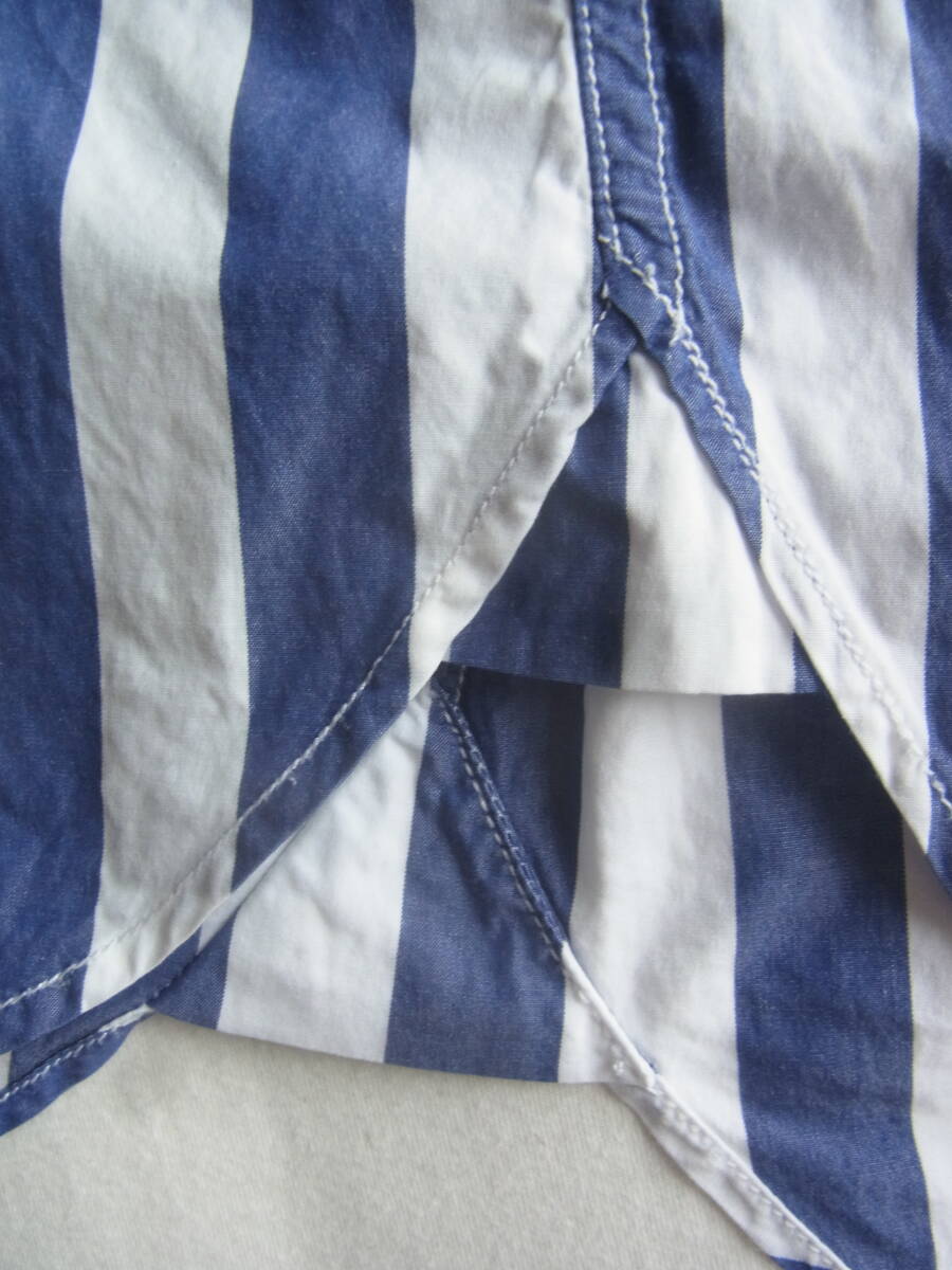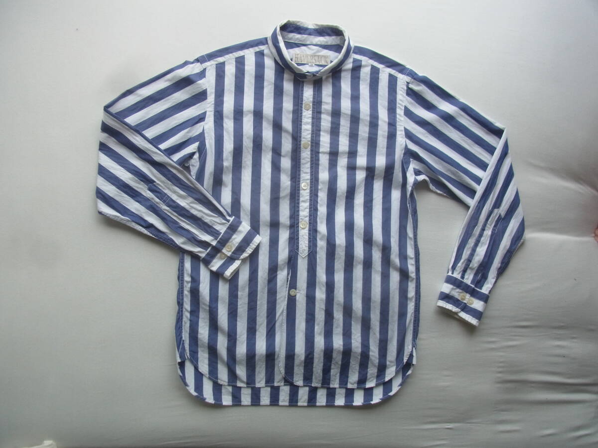 ハバーサックの太いストライプ柄でラウンドカラーのワークシャツになります。USEDで着用感と衿部分に薄く汚れは御座いますが、それ以外には特に目立ったダメージ等は御座いません。