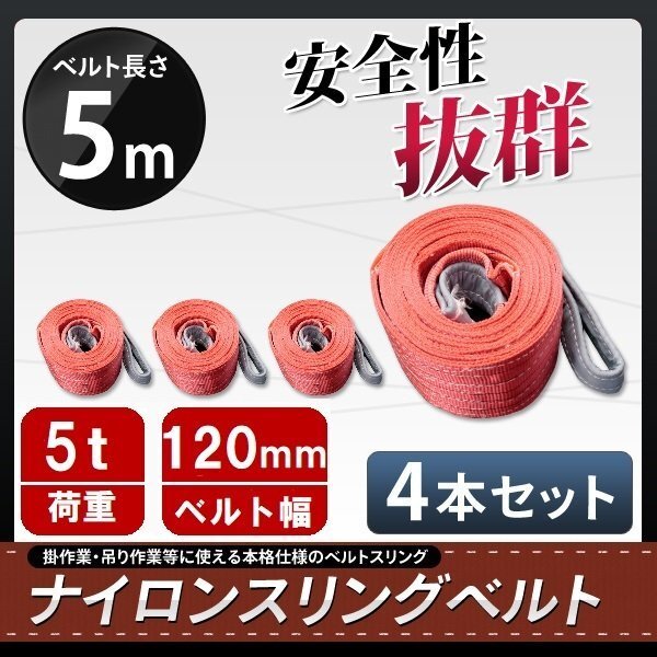 4本セット ナイロンスリングベルト 5m 幅125mm 荷重5000kg 5t 玉掛け ベルトスリング 吊上げ ロープ 牽引