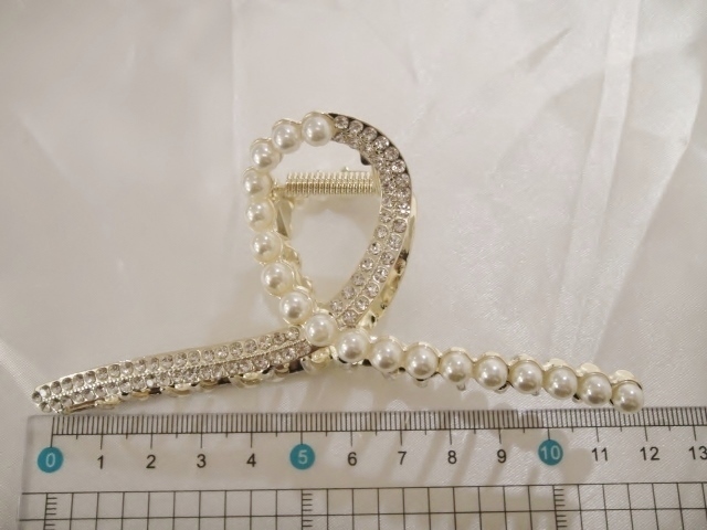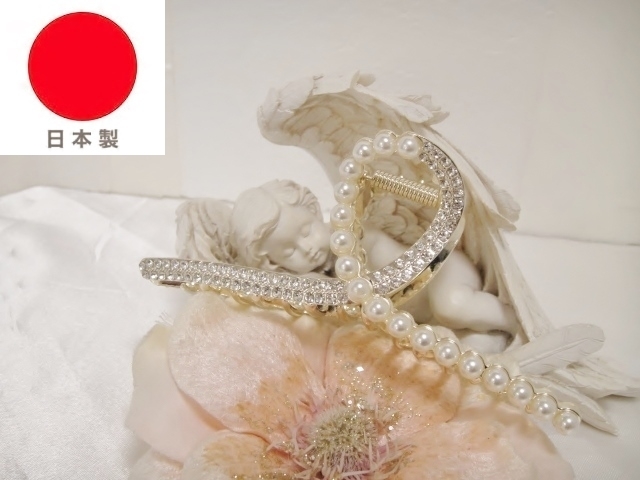 ♪ 新品 日本製 Made in Japan Mバンスクリップ『高品質/超スリムロングサイズ/特大リボン/軽量/強力バネ入り/パール&2連スワロフスキー』