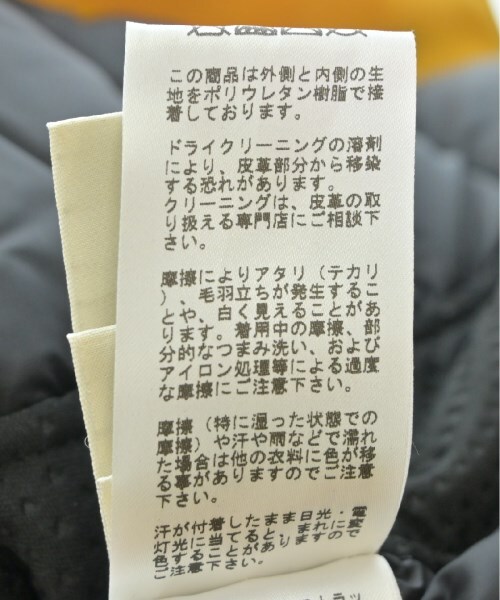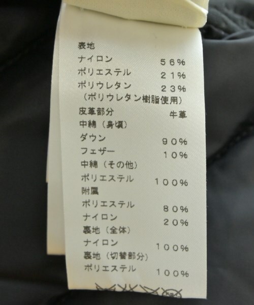 メイン素材:ナイロン56%、ポリウレタン23%、ポリエステル21%、(裏地)ポリエステル100%、(中綿)ダウン90%、フェザー10%、(付属)ポリエステル80%、ナイロン20%、(皮革部分)牛革