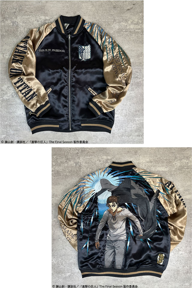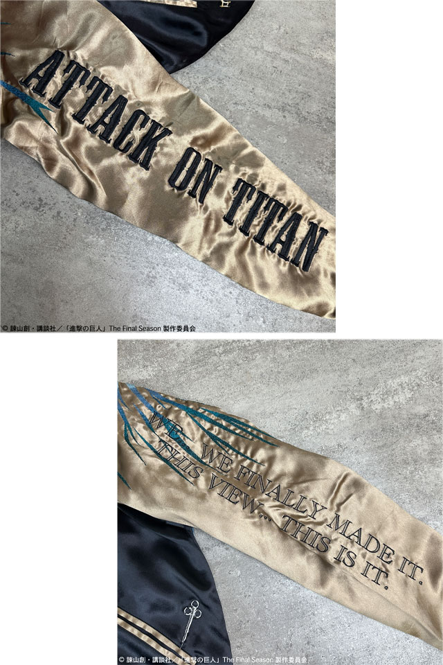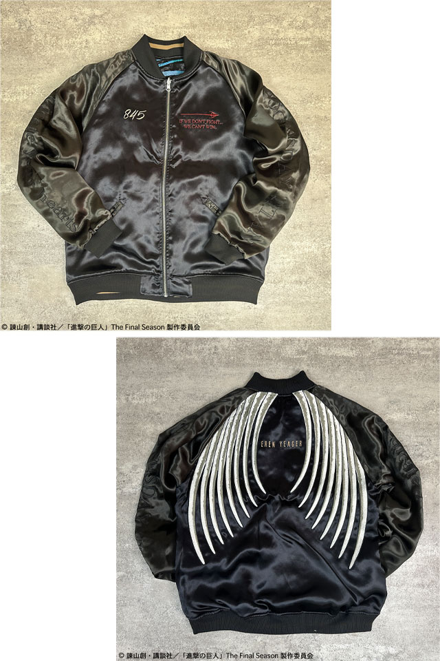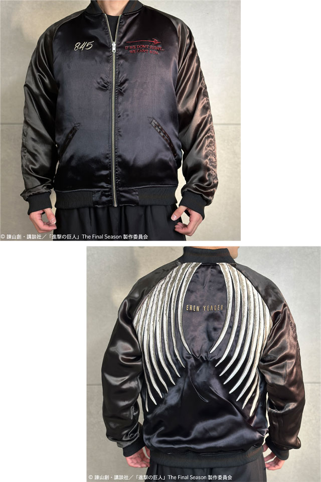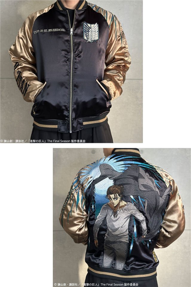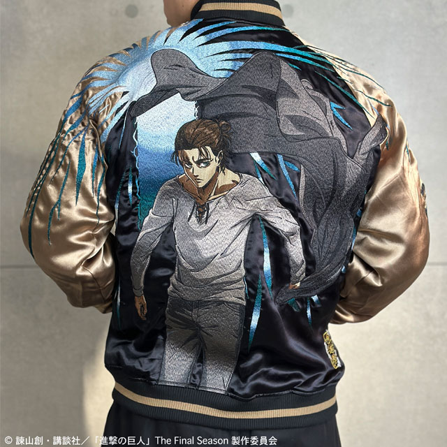 TVアニメ『進撃の巨人』と絡繰魂が初コラボレーション!! 本コラボでは《The Final Season》をチョイスし、最終話までの物語を投影したデザインに。 様々な苦悩、野望を抱える【エレン】と、『座標』をモチーフにした光の柱を背景にし、作中で感じられる想いや絶望感、自由へのもどかしさをスカジャン全体で表現。 リバーシブル表面フロント下部には、注射器と地下室の鍵を刺繍。 そしてリバーシブル裏面フロントには様々な意味をもった【845】の数字、バックには、【地鳴らし】を彷彿させるデザインに仕上げ、コラボならではの拘りとハイクオリティの一着です! | ||||||||||||||||||||