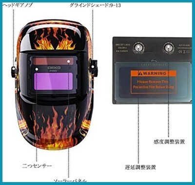 DEKO自動遮光溶接面 液晶式溶接マスク 遮光速度0.00004秒 瞬時遮光可 遮光度#9~#13ワイドビュータイプ ソーラー充電式 溶接マスク/溶接ヘルメット MIG TIG MMA用 (火炎)