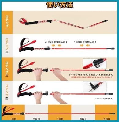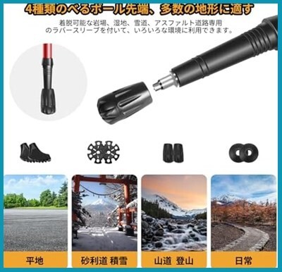 • パッケージ内容:トレッキングポール*2本 、トレッキング*4、ウォーキング*2*、バスケット*2、スノーバスケット*2、専用収納袋*1、日本語説明書。