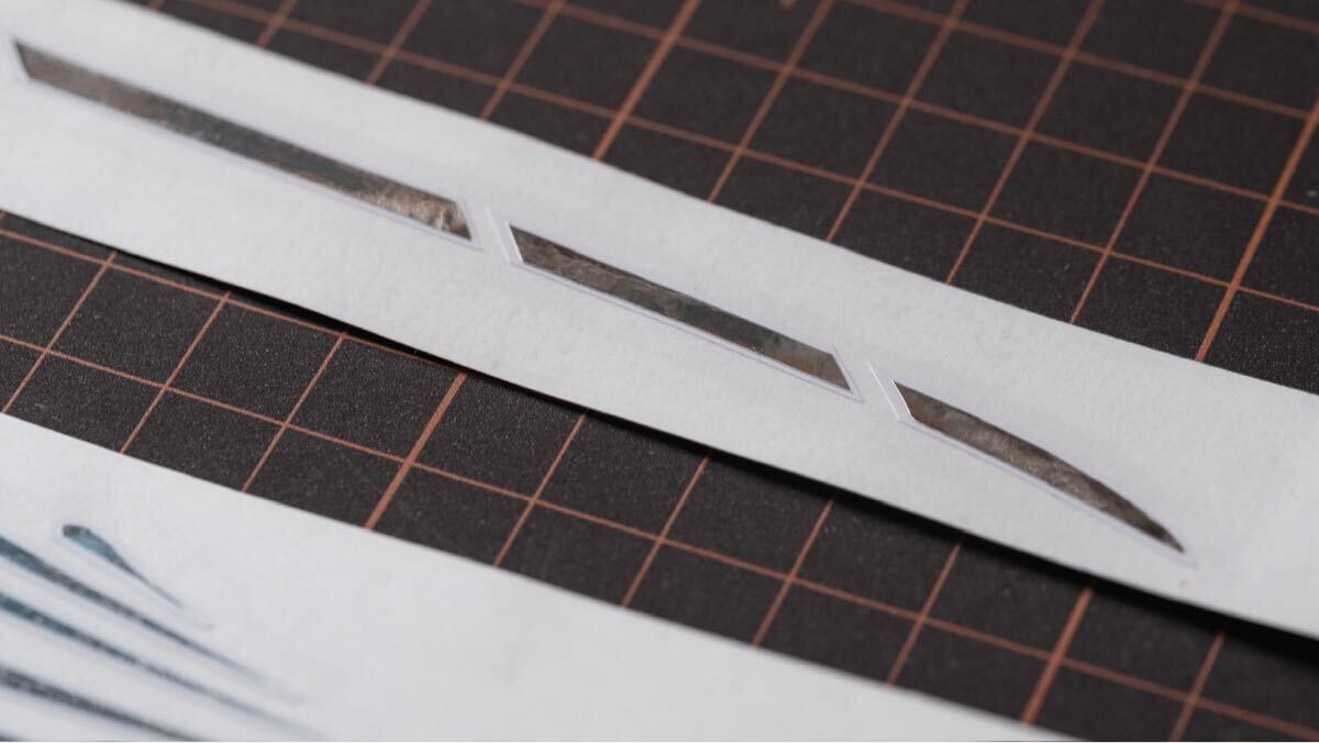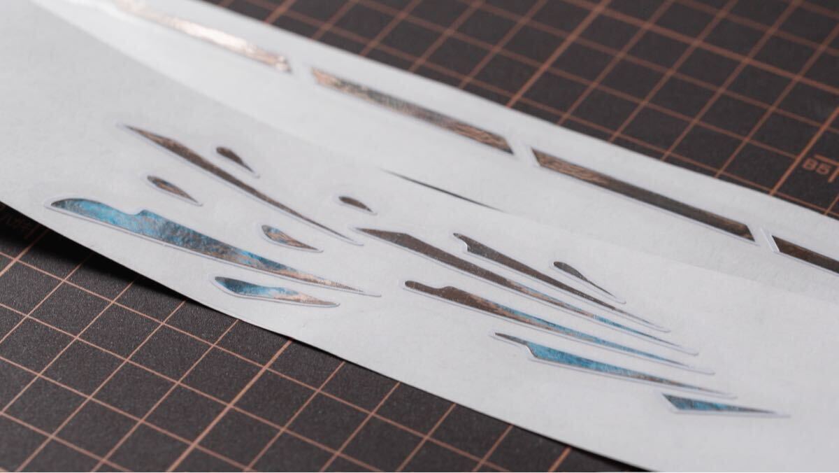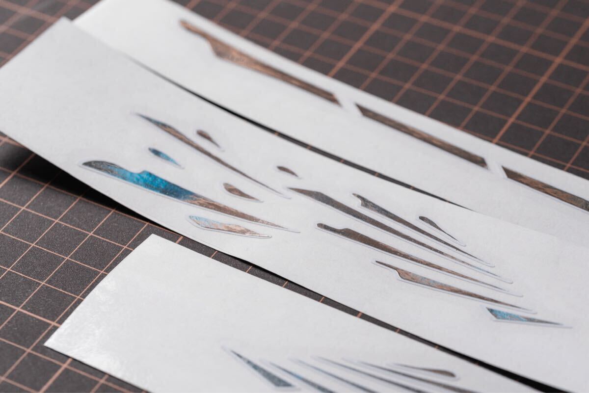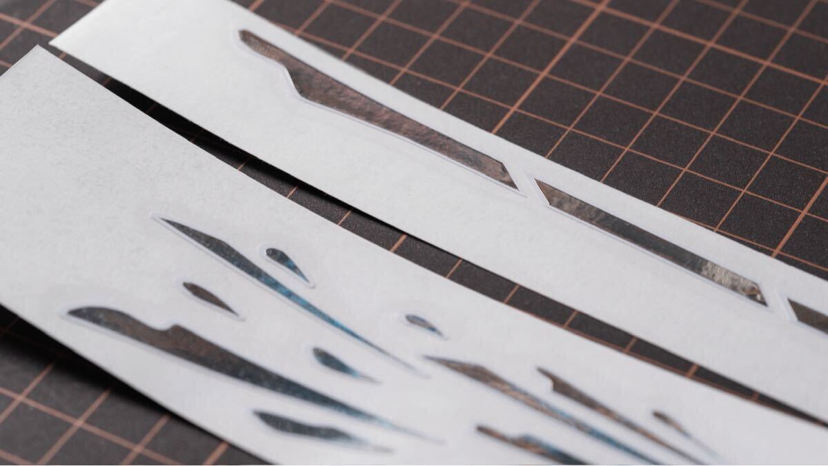 ・こちらは濃色車向けにホワイト下地にメッキシルバーを重ね張りしてあります。