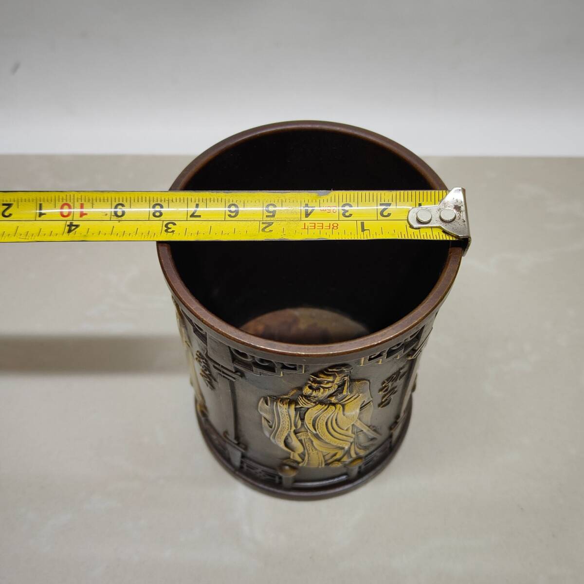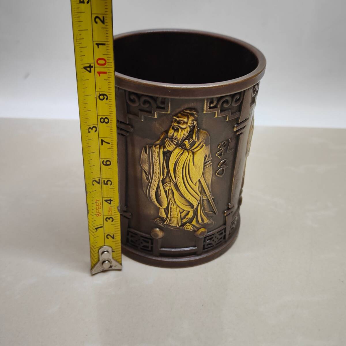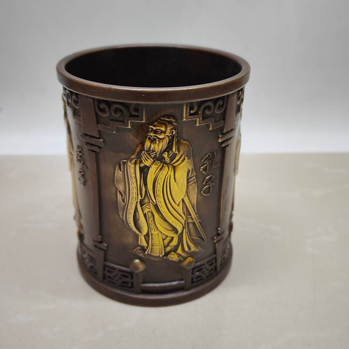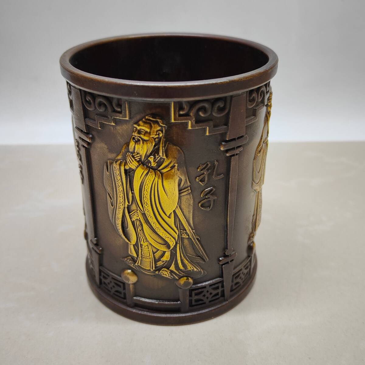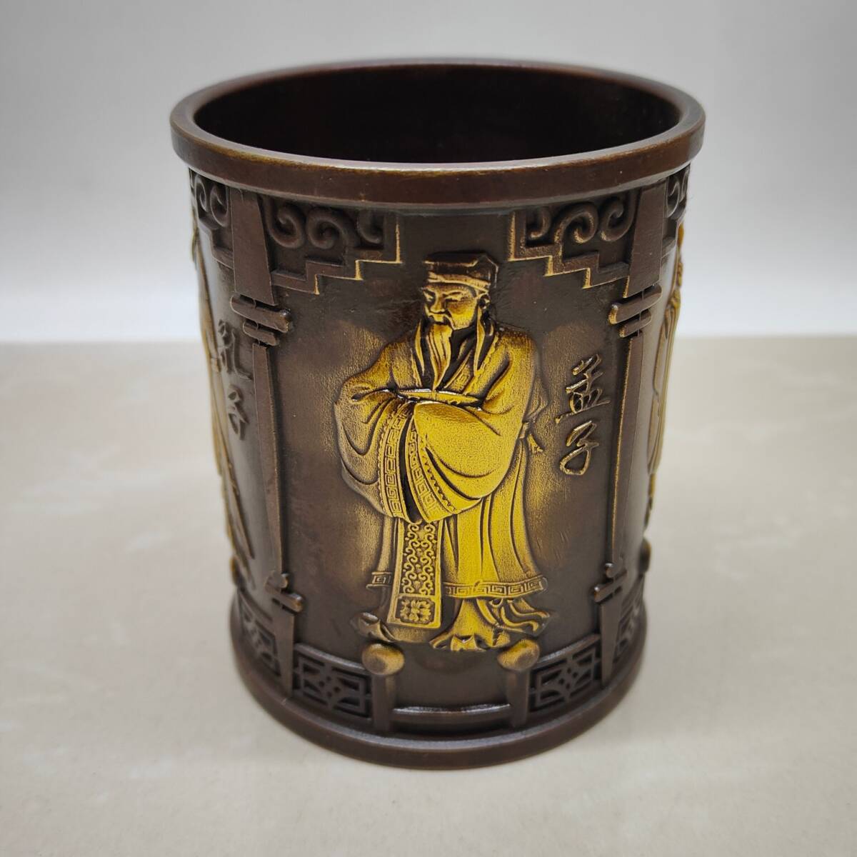 【超珍館蔵】黄銅製 塗金 孔子孟子紋 筆筒 置物 賞物 古賞物 古美術品 稀少珍蔵品