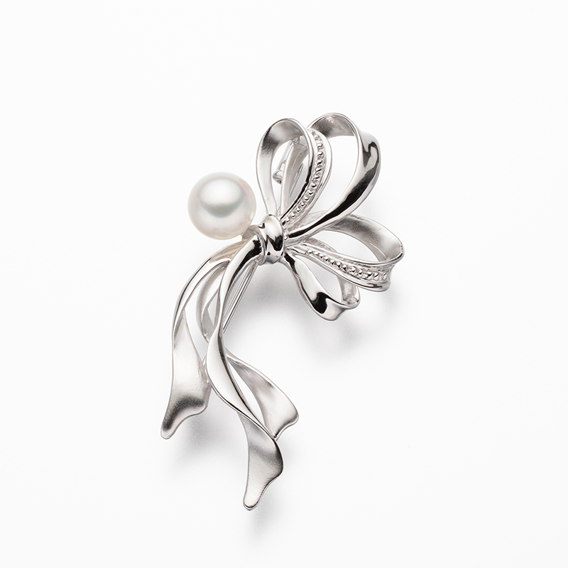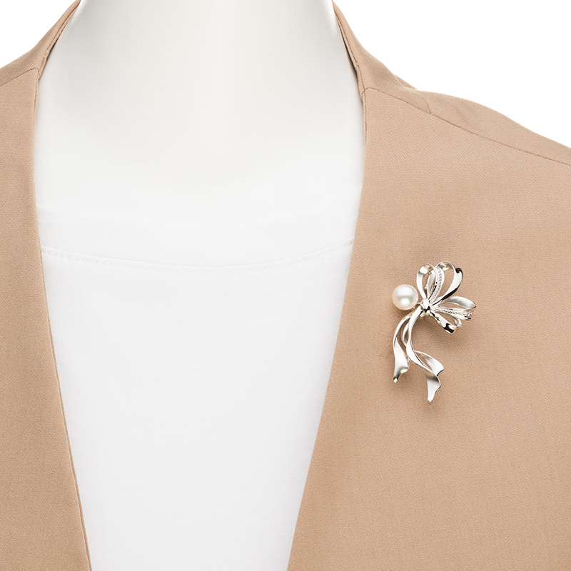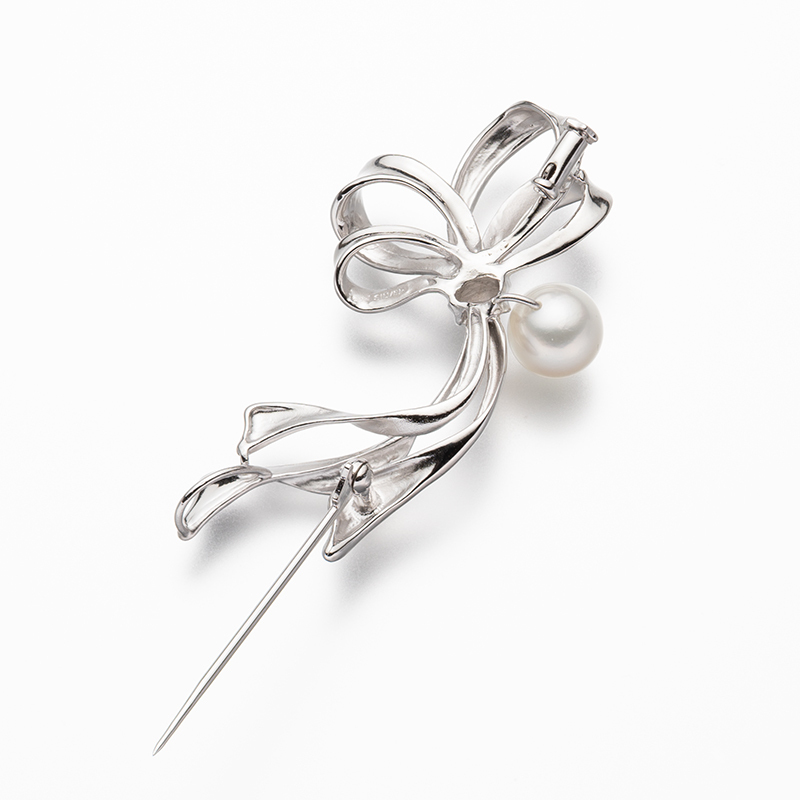8mmのアコヤパールをあしらった、リボンモチーフのシルバーブローチ。